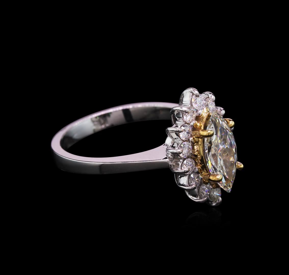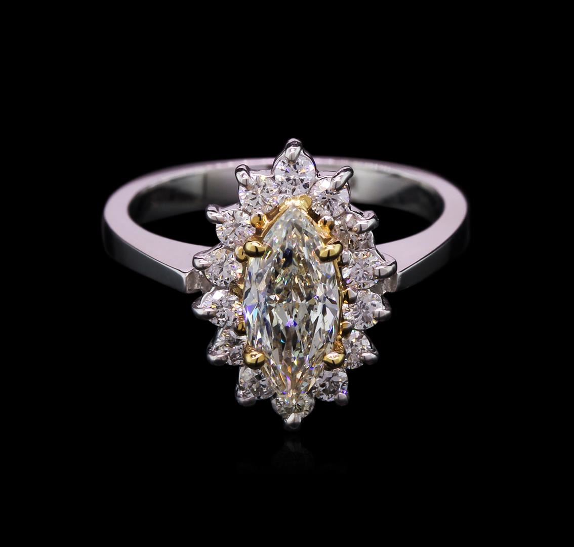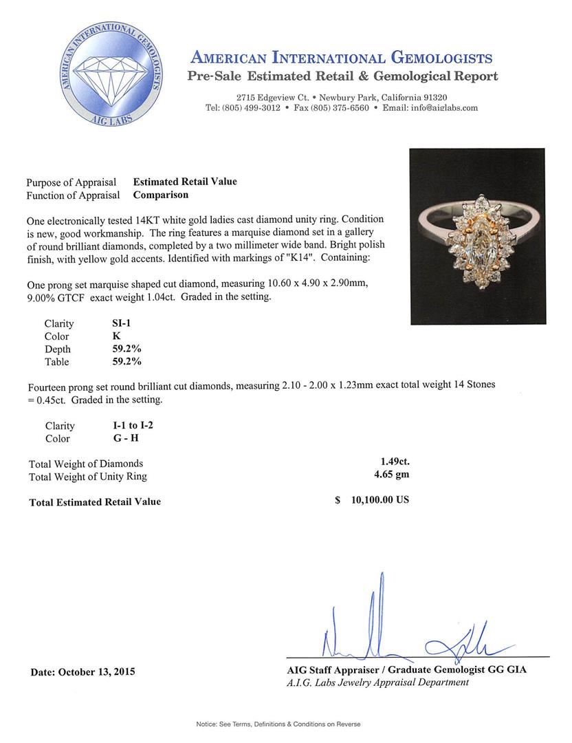 One electronically tested 14KT white gold ladies cast diamond unity ring. The ring features a marquise diamond set in a gallery of round brilliant diamonds, completed by a two millimeter wide band. Bright polish finish, with yellow gold accents. Identified with markings of "K14". Condition is new, good workmanship. Containing: One prong set marquise shaped cut diamond, measuring 10.60 x 4.90 x 2.90mm, 9.00% GTCF exact weight 1.04ct. Graded in the setting. Clarity: SI-1. Color: K. Depth 59.2%. Table 59.2%. Fourteen prong set round brilliant cut diamonds, measuring 2.10 - 2.00 x 1.23mm exact total weight 14 Stones = 0.45ct. Graded in the setting. Clarity: I-1 to I-2. Color: G - H. Total Weight of Diamonds 1.49ct. Total Weight of Unity Ring 4.65gm. AIG Appraised at $10,100.00.