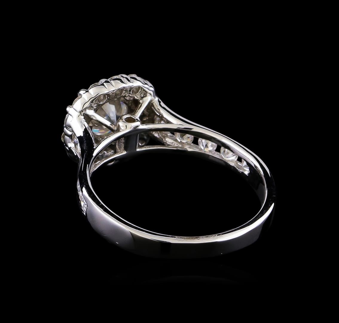 One electronically tested 14KT white gold lady's cast wedding ring with a cathedral halo with a bright polish finish. The featured lady's ring has a shank measuring 2.52 millimeters in width. Identified with markings of "14K". Condition is new, good workmanship. Containing: One prong set round brilliant cut diamond, measuring 5.72 - 5.65 x 3.68mm (depth est.) , 10.00.%. GTCF approximate weight of 0.84ct. Graded in the setting. Clarity: SI-2. Color: H - I. Cut Good Fourteen prong set round brilliant cut diamonds, measuring 1.80 - 1.75 x 1.10mm (depth est.) approximate total weight of 14 Stones = 0.33ct. Graded in the setting. Clarity: SI-1 to SI-2. Color: H - I. Cut Good Ten channel set round brilliant cut diamonds, measuring 2.00 - 1.95 x 1.25mm (depth est.) approximate total weight of 10 Stones = 0.32ct. Graded in the setting. Clarity: SI-1 to SI-3. Color: H - I. Cut Good. Total Weight of Diamonds 1.49ct. Total Weight of Ring 3.70gm. GAS Appraised at $9,540.00.