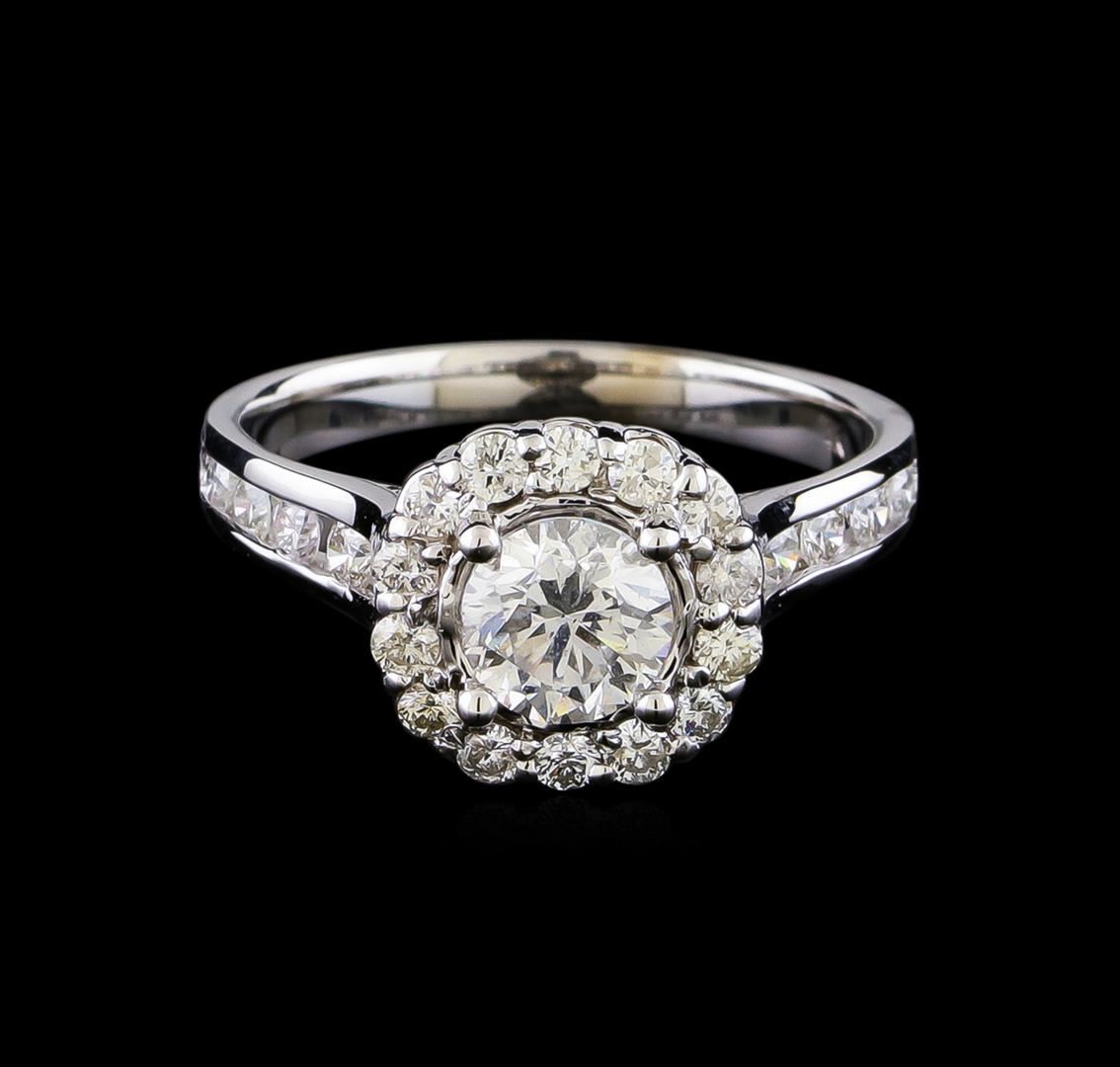 One electronically tested 14KT white gold lady's cast wedding ring with a cathedral halo with a bright polish finish. The featured lady's ring has a shank measuring 2.52 millimeters in width. Identified with markings of "14K". Condition is new, good workmanship. Containing: One prong set round brilliant cut diamond, measuring 5.72 - 5.65 x 3.68mm (depth est.) , 10.00.%. GTCF approximate weight of 0.84ct. Graded in the setting. Clarity: SI-2. Color: H - I. Cut Good Fourteen prong set round brilliant cut diamonds, measuring 1.80 - 1.75 x 1.10mm (depth est.) approximate total weight of 14 Stones = 0.33ct. Graded in the setting. Clarity: SI-1 to SI-2. Color: H - I. Cut Good Ten channel set round brilliant cut diamonds, measuring 2.00 - 1.95 x 1.25mm (depth est.) approximate total weight of 10 Stones = 0.32ct. Graded in the setting. Clarity: SI-1 to SI-3. Color: H - I. Cut Good. Total Weight of Diamonds 1.49ct. Total Weight of Ring 3.70gm. GAS Appraised at $9,540.00.