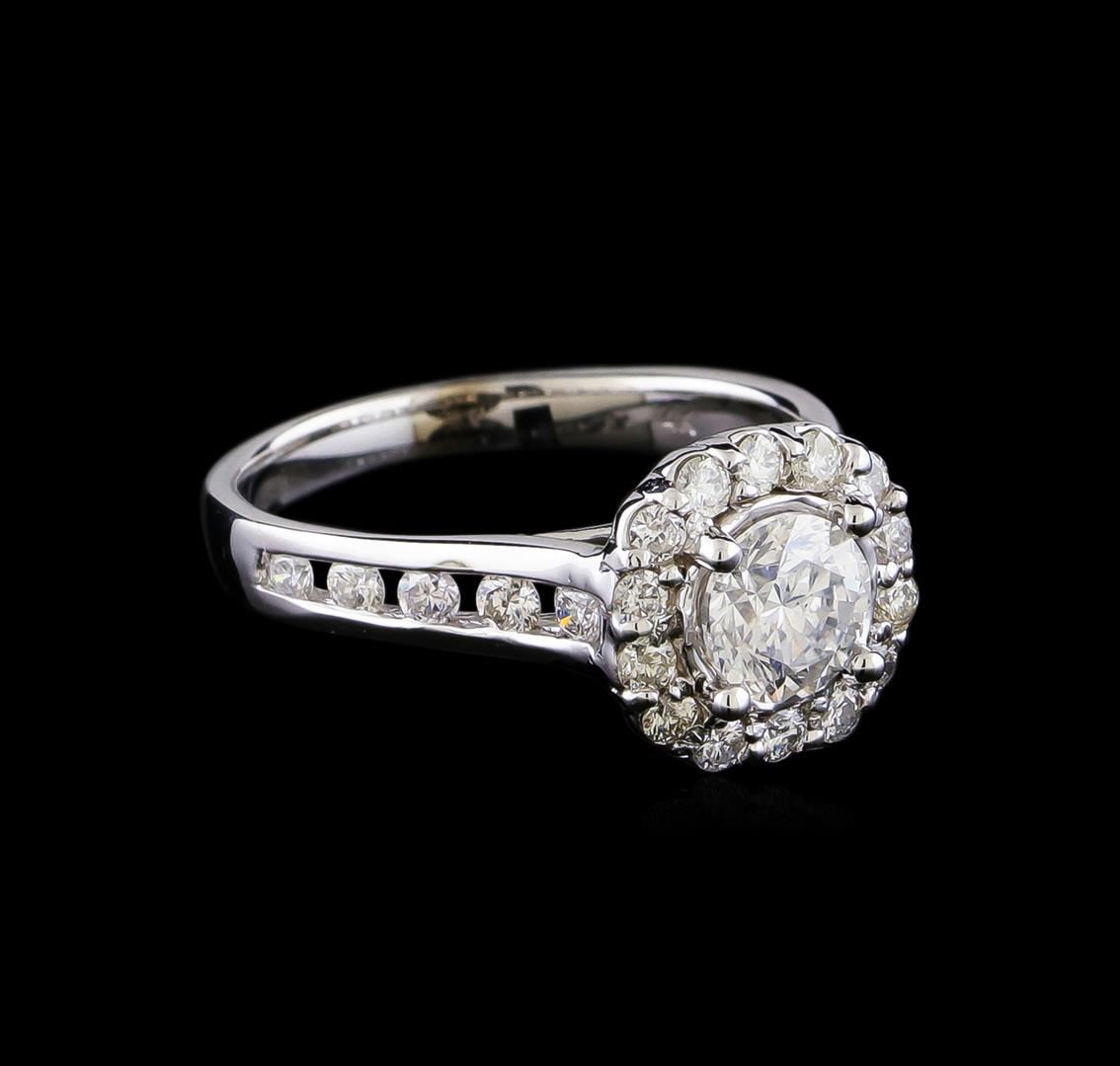 One electronically tested 14KT white gold lady's cast wedding ring with a cathedral halo with a bright polish finish. The featured lady's ring has a shank measuring 2.52 millimeters in width. Identified with markings of "14K". Condition is new, good workmanship. Containing: One prong set round brilliant cut diamond, measuring 5.72 - 5.65 x 3.68mm (depth est.) , 10.00.%. GTCF approximate weight of 0.84ct. Graded in the setting. Clarity: SI-2. Color: H - I. Cut Good Fourteen prong set round brilliant cut diamonds, measuring 1.80 - 1.75 x 1.10mm (depth est.) approximate total weight of 14 Stones = 0.33ct. Graded in the setting. Clarity: SI-1 to SI-2. Color: H - I. Cut Good Ten channel set round brilliant cut diamonds, measuring 2.00 - 1.95 x 1.25mm (depth est.) approximate total weight of 10 Stones = 0.32ct. Graded in the setting. Clarity: SI-1 to SI-3. Color: H - I. Cut Good. Total Weight of Diamonds 1.49ct. Total Weight of Ring 3.70gm. GAS Appraised at $9,540.00.