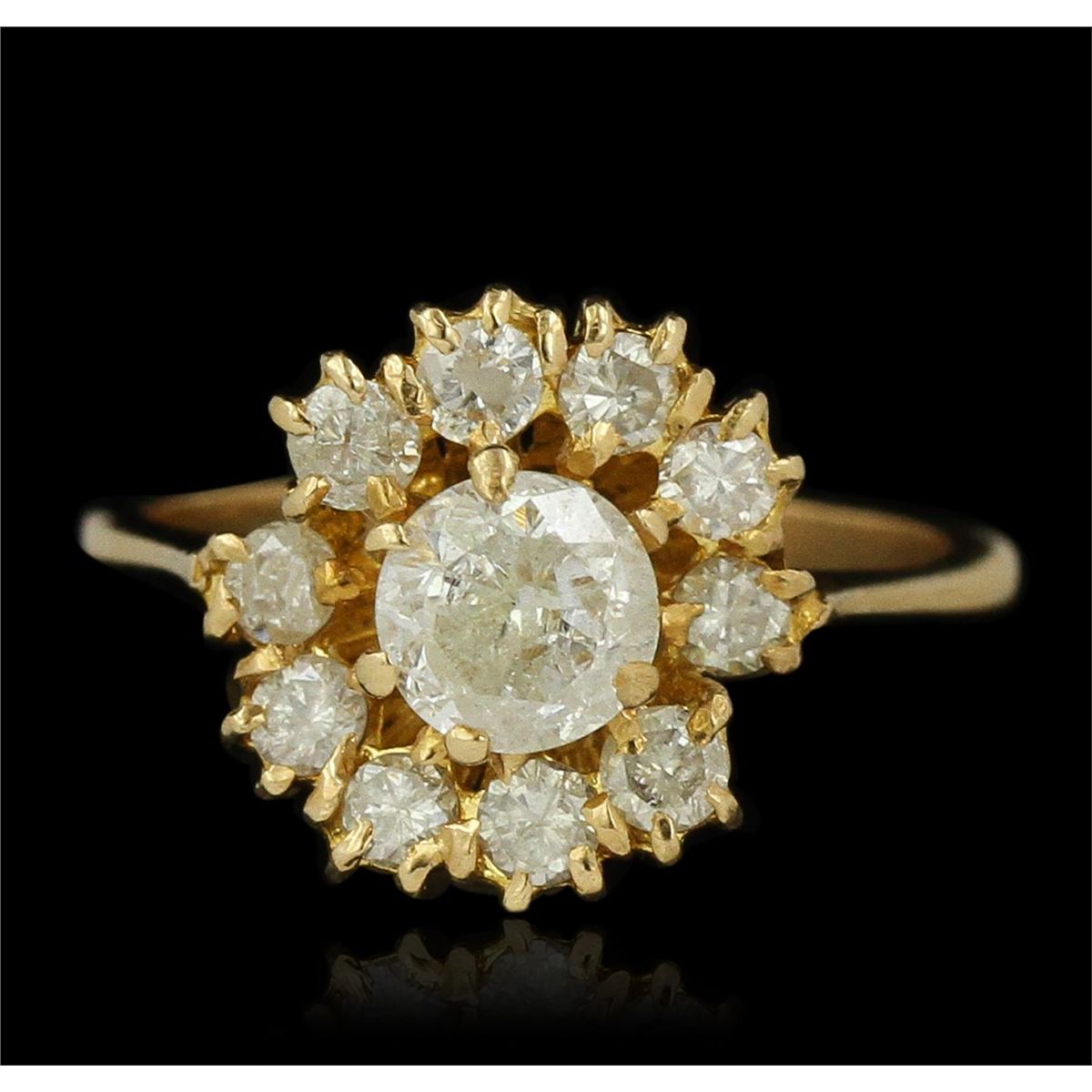 18KT Yellow Gold 1.49ctw Diamond Engagement Ring A8411. Very Good Condition! FV409GB. One electronically tested 18KT yellow gold lady's combination cast & assembled engagement ring with a bright polish finish. Condition is very good. Containing: One prong set Old European cut diamond, measuring 5.70 - 5.70 x 3.90mm (depth est.) approximate weight of 0.77ct. Clarity: I-3. Color: K, Cut is Fair. Ten prong set round brilliant cut diamonds, measuring 2.50 - 2.50 x 1.88mm (depth est.) approximate. Total Weight of 10 Stones = 0.72ct. Clarity: I-1 to I-2. Color: J - K, Cut is Good. Total Weight of Diamonds 1.49ct. Total Weight of Ring 3.50gm. GGL Appraised at $5,540.00. GGL Appraised.
