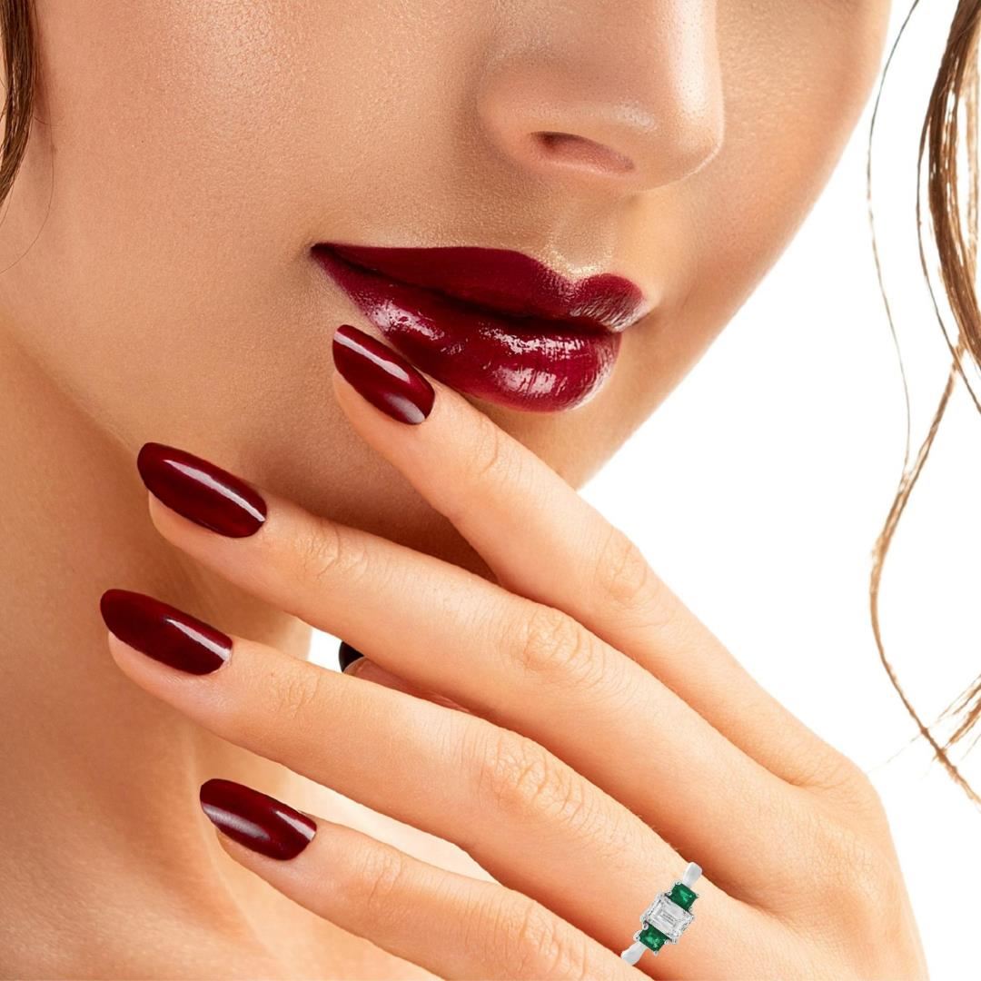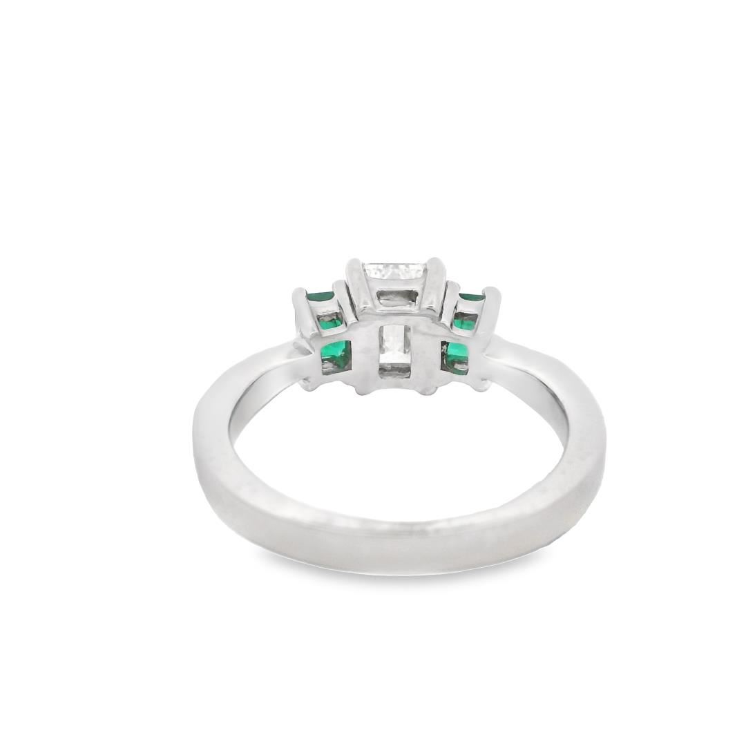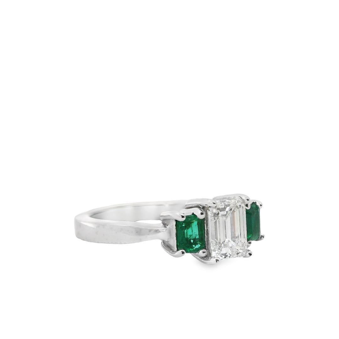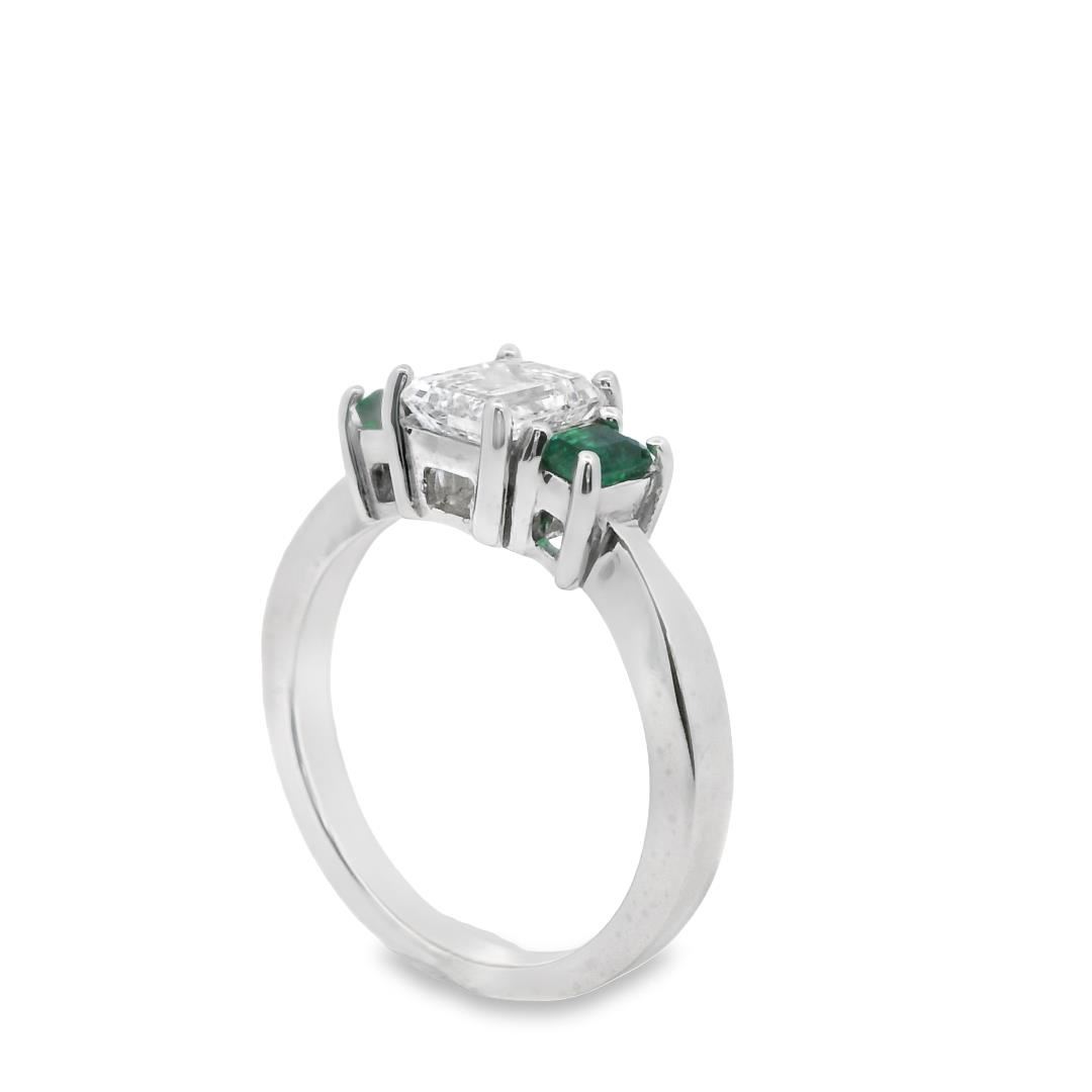 This stunning three-stone ring features a GIA-certified 1.00ct emerald cut diamond with VS-2 clarity, flanked by 0.50ct of natural emeralds with a vibrant bluish green hue. A beautiful and unique design! One electronically tested 14KT white gold lady's cast fashion three stone ring with a basket motif with a bright polish finish. Condition is new, good workmanship. The featured lady's ring has a shank measuring 2.5 millimeters in width. Identified with markings of 14K. Containing: One prong set emerald cut diamond, measuring 6.60 x 4.86 x 3.22mm (depth est.) approximate weight of 1.00ct. GIA Gem Trade Laboratory Report # 1485390447. Color: I Clarity: VS-2 Cut: Very Good Two prong set emerald step cut natural emeralds, measuring 4.05 x 3.50 x 2.60mm (depth est.) approximate total weight of 0.50ct., clarity is eye clean, very slightly bluish green color, (GIA vslbG 0/0), cut is very good. Colored gemstones are presumed to have been subjected to commonly used enhancement processes. Transmitting light with a minimum of distortion, transparent. Graded in the setting. Total Weight of Colored Stones: 0.50ct. Total Weight of Diamonds: 1.00ct. Total Weight of Ring: 4.60gm Total Estimated Retail Value: $11500.00 Appraisal No: 000024088012