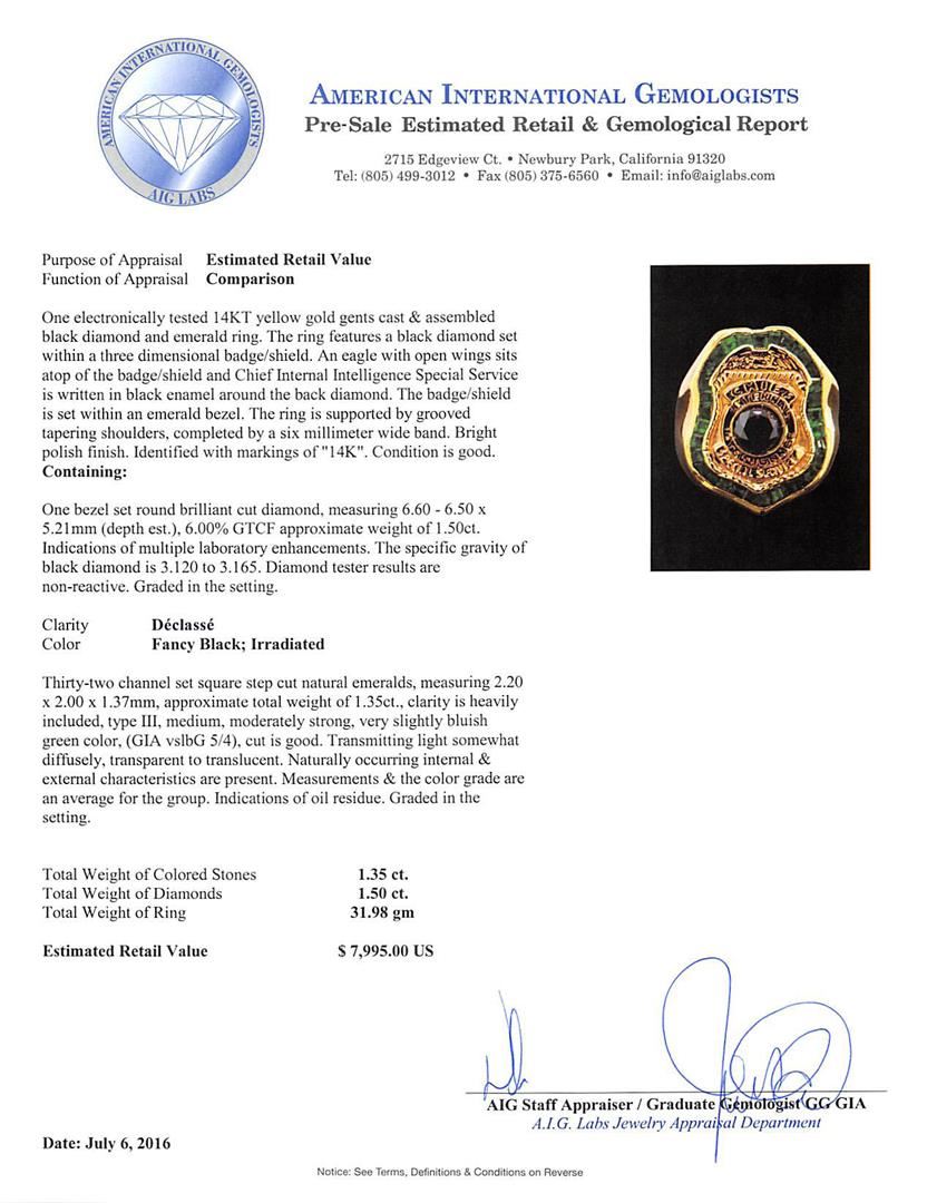One electronically tested 14KT yellow gold gents cast & assembled black diamond and emerald ring. The ring features a black diamond set within a three dimensional badge/shield. An eagle with open wings sits atop of the badge/shield and Chief Internal Intelligence Special Service is written in black enamel around the back diamond. The badge/shield is set within an emerald bezel. The ring is supported by grooved tapering shoulders, completed by a six millimeter wide band. Bright polish finish. Identified with markings of "14K". Condition is good. Containing: One bezel set round brilliant cut diamond, measuring 6.60 - 6.50 x 5.21mm (depth est.), 6.00.%. GTCF approximate weight of 1.50ct. Indications of multiple laboratory enhancements. The specific gravity of black diamond is 3.120 to 3.165. Diamond tester results are non-reactive. Graded in the setting. Clarity Déclassé,. Color: Fancy Black; Irradiated. Thirty-two channel set square step cut natural emeralds, measuring 2.20 x 2.00 x 1.37mm, approximate total weight of 1.35ct., clarity is heavily included, type III, medium, moderately strong, very slightly bluish green color, (GIA vslbG 5/4), cut is good. Transmitting light somewhat diffusely, transparent to translucent. Naturally occurring internal & external characteristics are present. Measurements & the color grade are an average for the group. Indications of oil residue. Graded in the setting. Total Weight of Colored Stones 1.35ct. Total Weight of Diamonds 1.50ct. Total Weight of Ring 31.98gm. AIG Appraised at $7,995.00.