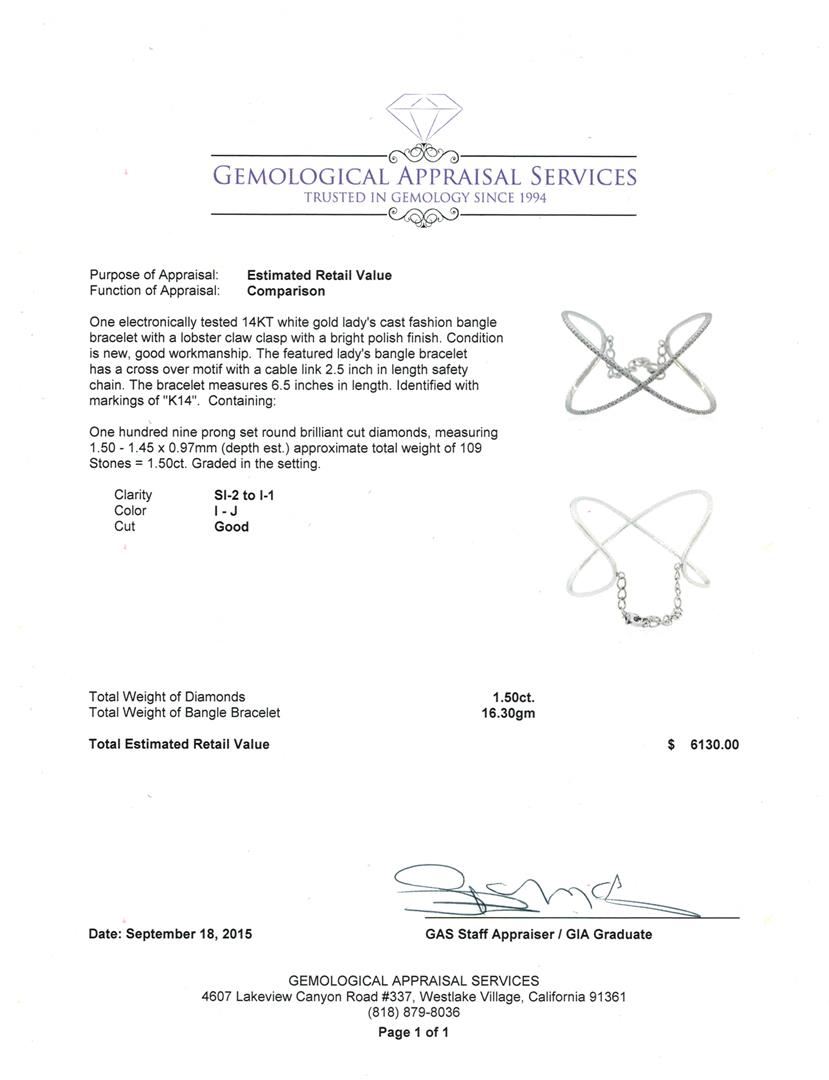 One electronically tested 14KT white gold lady's cast fashion bangle bracelet with a lobster claw clasp with a bright polish finish. The featured lady's bangle bracelet has a cross over motif with a cable link 2.5 inch in length safety chain. The bracelet measures 6.5 inches in length. Identified with markings of "K14". Condition is new, good workmanship. Containing: One Hundred Nine prong set round brilliant cut diamonds, measuring 1.50 - 1.45 x 0.97mm (depth est.) approximate total weight of 109 Stones = 1.50ct. Graded in the setting. Clarity: SI-2 to I-1. Color: I - Good. Total Weight of Diamonds 1.50ct. Total Weight of Bangle Bracelet 16.30gm. GAS Appraised at $6,130.00.