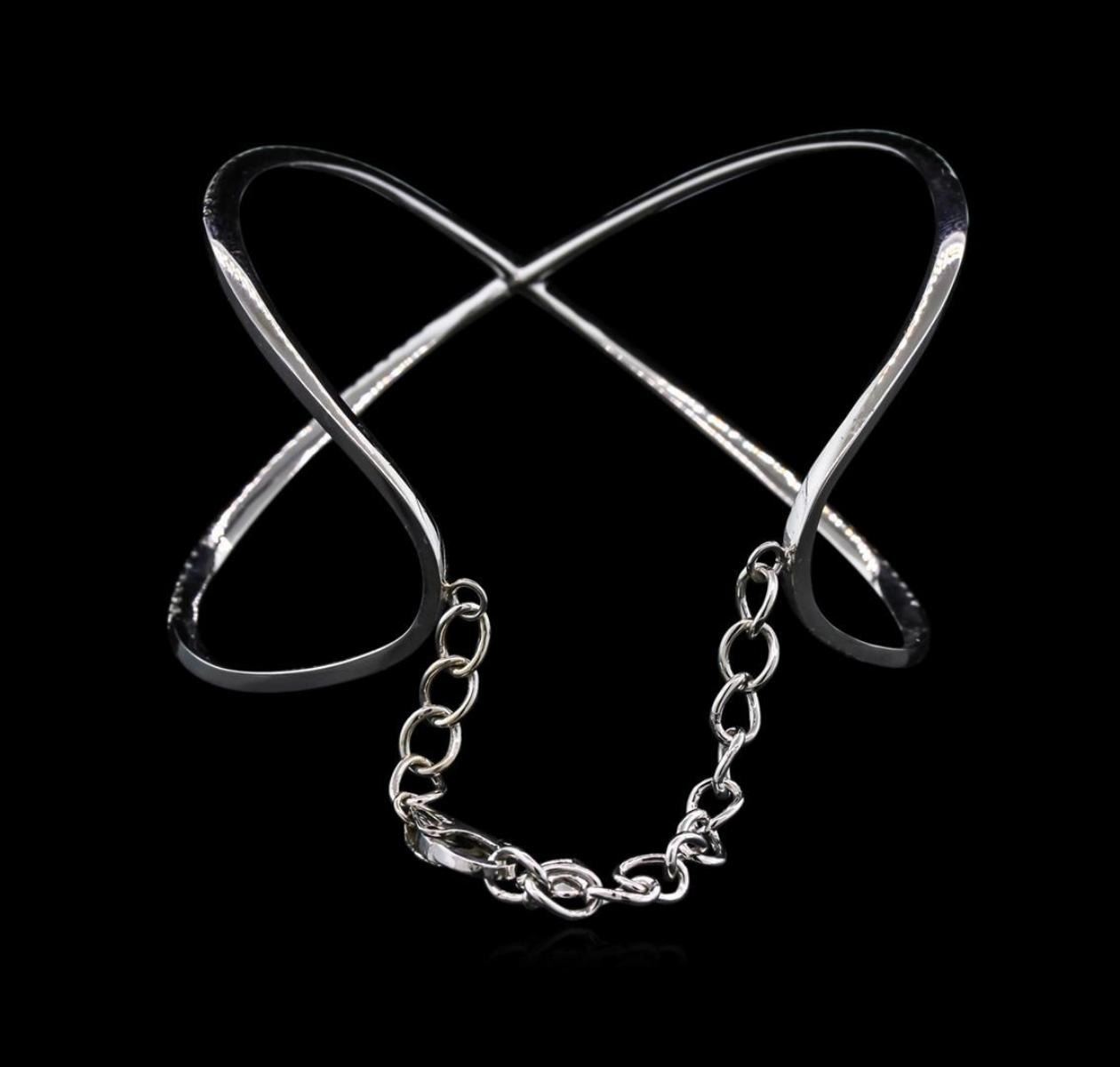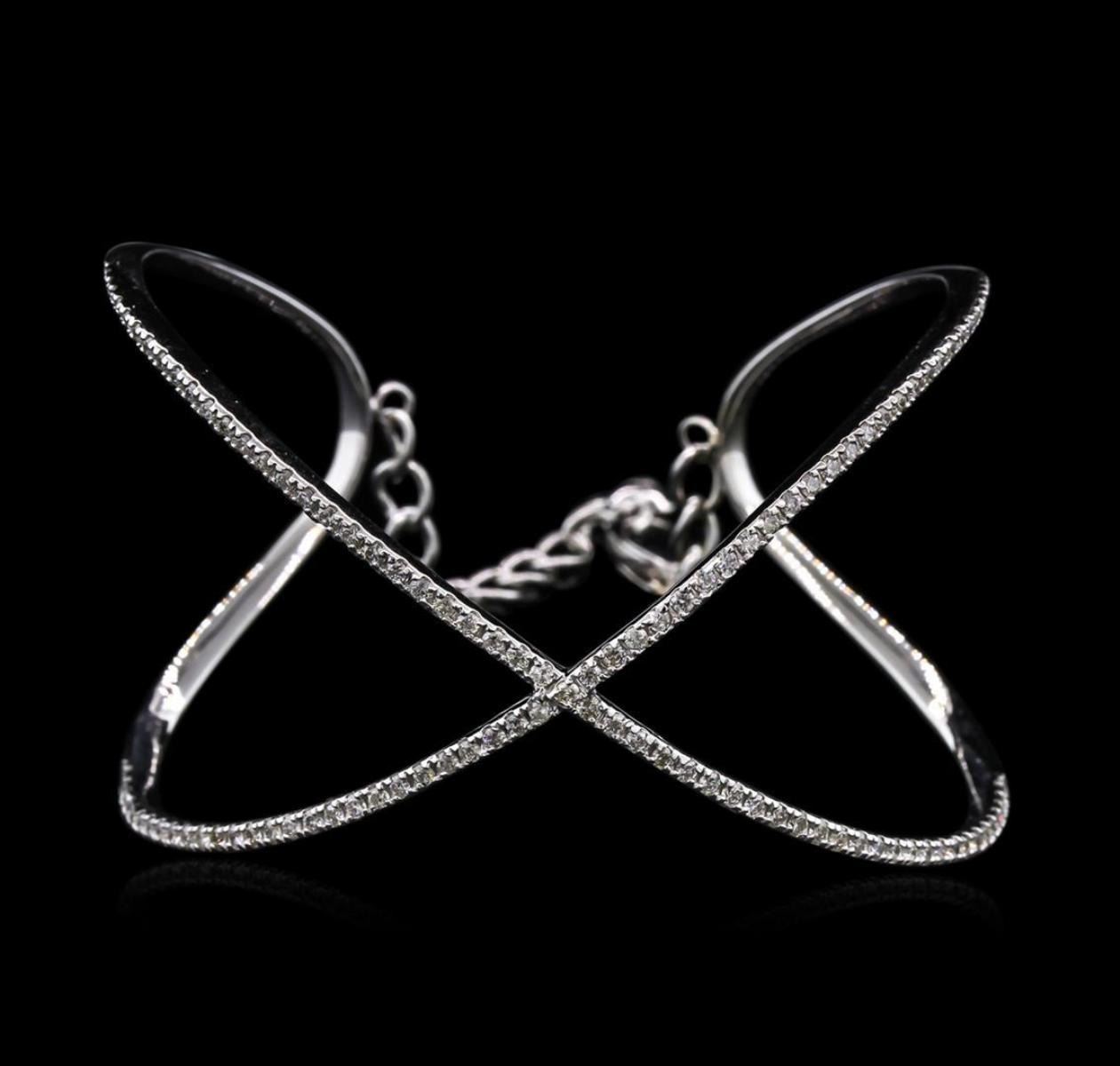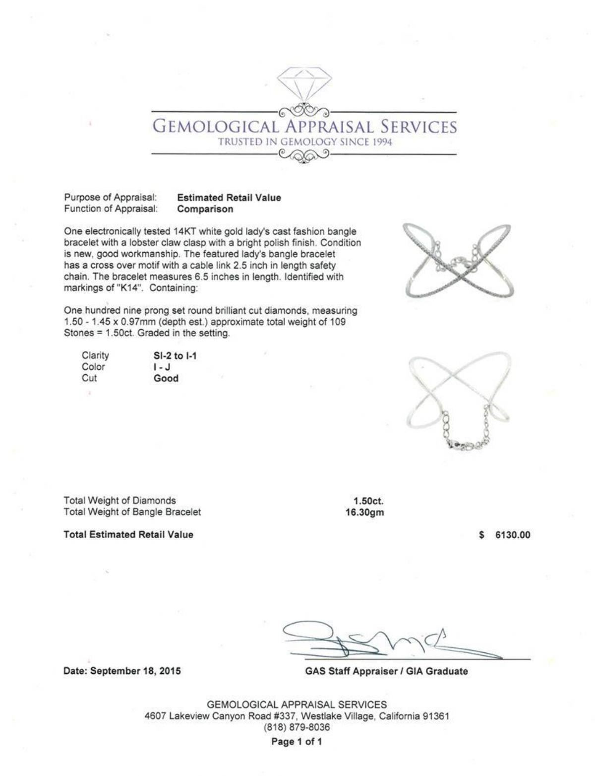 One electronically tested 14KT white gold lady's cast fashion bangle bracelet with a lobster claw clasp with a bright polish finish. The featured lady's bangle bracelet has a cross over motif with a cable link 2.5 inch in length safety chain. The bracelet measures 6.5 inches in length. Identified with markings of "K14". Condition is new, good workmanship. Containing: One Hundred Nine prong set round brilliant cut diamonds, measuring 1.50 - 1.45 x 0.97mm (depth est.) approximate total weight of 109 Stones = 1.50ct. Graded in the setting. Clarity: SI-2 to I-1. Color: I - Good. Total Weight of Diamonds 1.50ct. Total Weight of Bangle Bracelet 16.30gm. GAS Appraised.