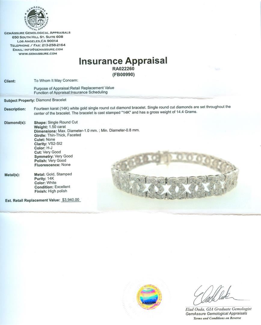 One 14KT white gold bracelet weighing 14.4 grams containing diamonds with VS2-SI2 clarity and H-J color weighing 1.50ctw. GGA Appraised at $3,940.00.