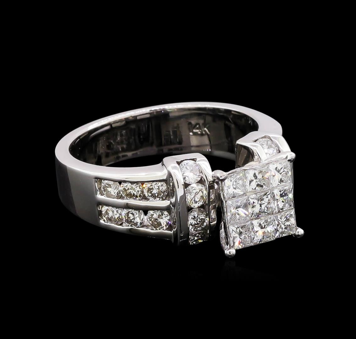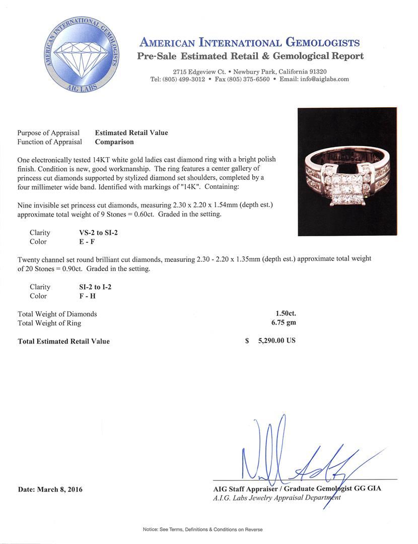 One electronically tested 14KT white gold ladies cast diamond ring with a bright polish finish. The ring features a center gallery of princess cut diamonds supported by stylized diamond set shoulders, completed by a four millimeter wide band. Identified with markings of "14K". Condition is new, good workmanship. Containing: Nine invisible set princess cut diamonds, measuring 2.30 x 2.20 x 1.54mm (depth est.) approximate total weight of 9 Stones = 0.60ct. Graded in the setting. Clarity: VS-2 to SI-2. Color: E - F Twenty channel set round brilliant cut diamonds, measuring 2.30 - 2.20 x 1.35mm (depth est.) approximate total weight of 20 Stones = 0.90ct. Graded in the setting. Clarity: SI-2 to I-2. Color: F - H. Total Weight of Diamonds 1.50ct. Total Weight of Ring 6.75gm. AIG Appraised at $5,290.00.