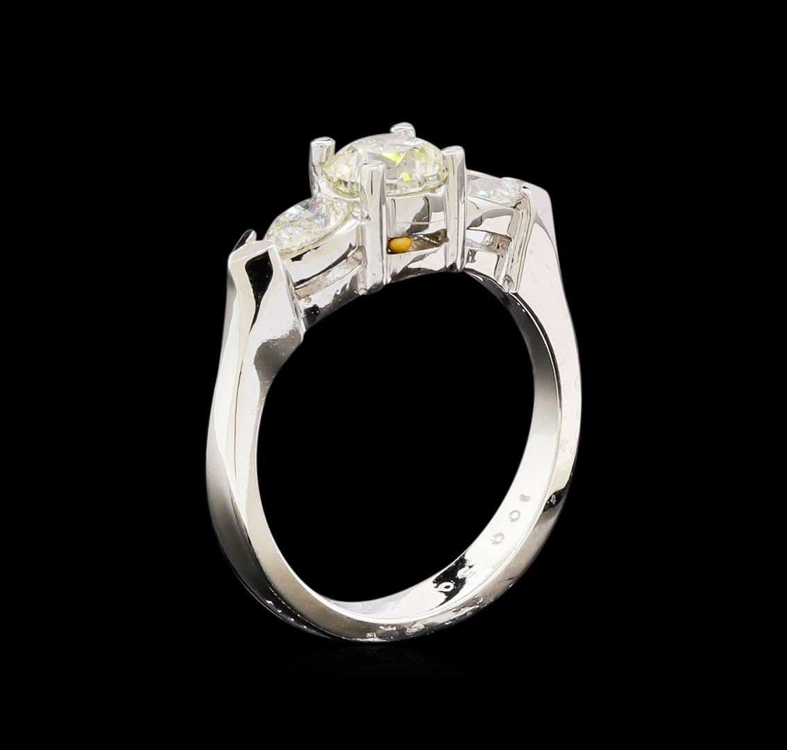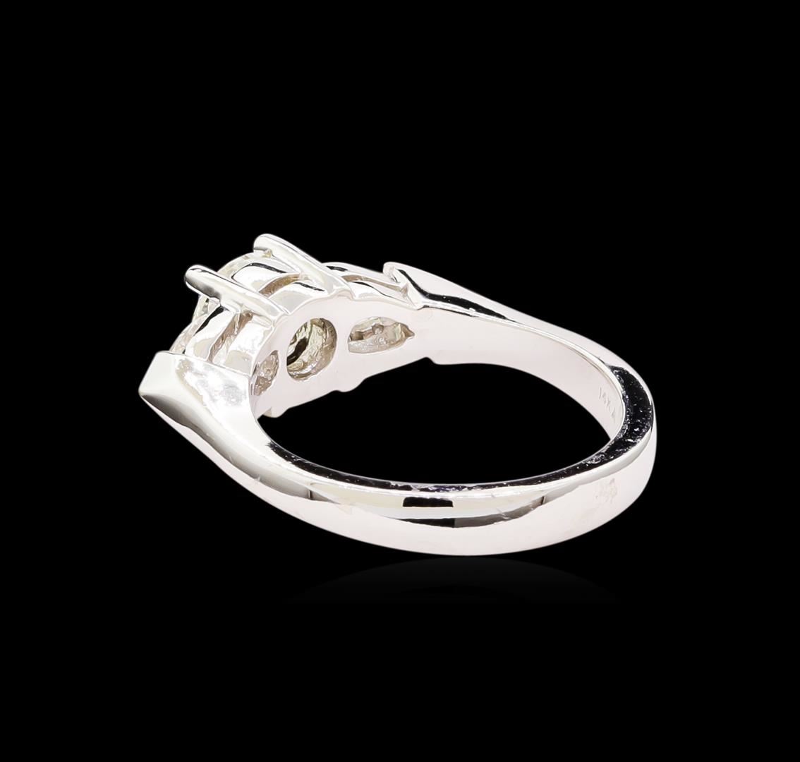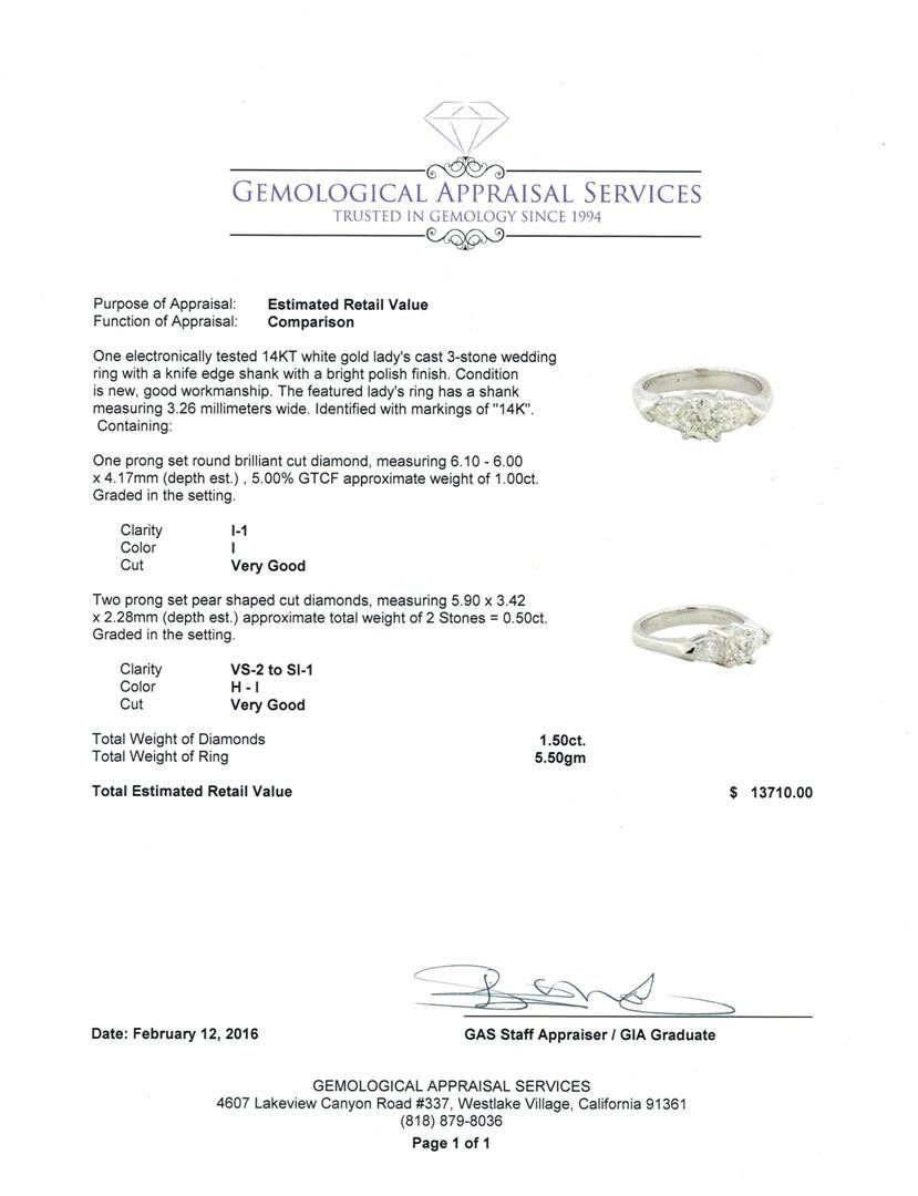 One electronically tested 14KT white gold lady's cast 3-stone wedding ring with a knife edge shank with a bright polish finish. The featured lady's ring has a shank measuring 3.26 millimeters wide. Identified with markings of "14K". Condition is new, good workmanship. Containing: One prong set round brilliant cut diamond, measuring 6.10 - 6.00 x 4.17mm (depth est.) , 5.00.%. GTCF approximate weight of 1.00ct. Graded in the setting. Clarity: I-1. Color: I. Cut Very Good Two prong set pear shaped cut diamonds, measuring 5.90 x 3.42 x 2.28mm (depth est.) approximate total weight of 2 Stones = 0.50ct. Graded in the setting. Clarity: VS-2 to SI-1. Color: H - I. Cut Very Good. Total Weight of Diamonds 1.50ct. Total Weight of Ring 5.50gm. GAS Appraised at $13,710.00.