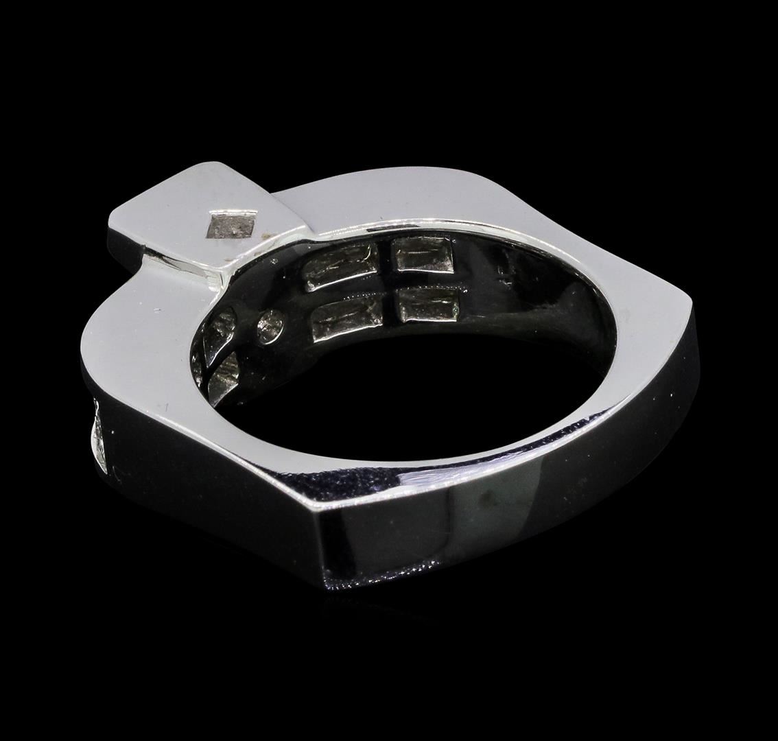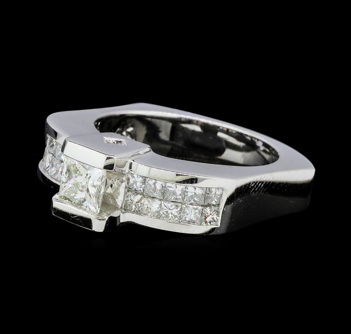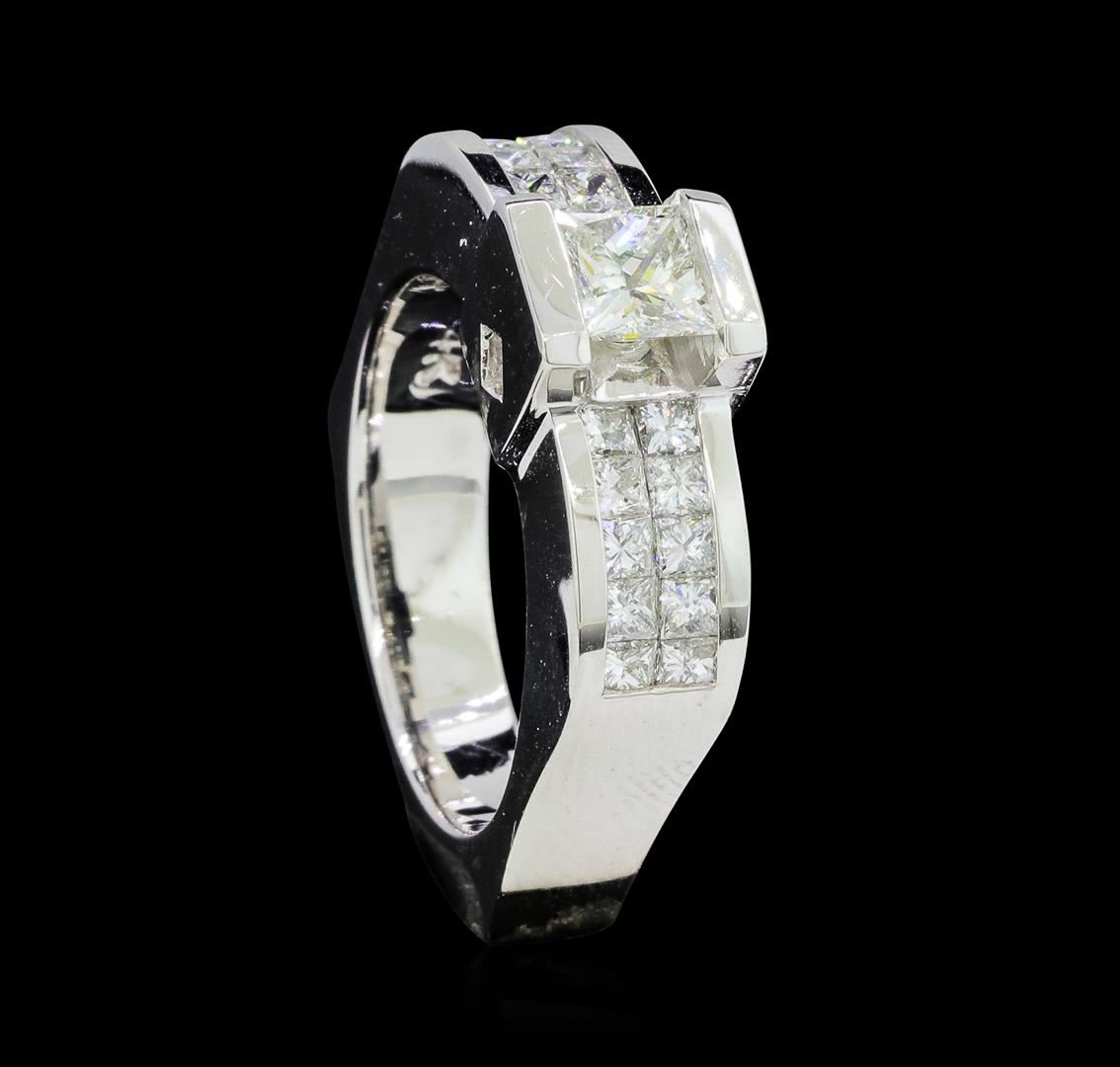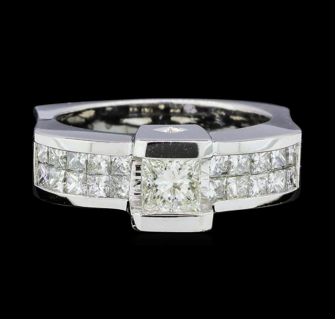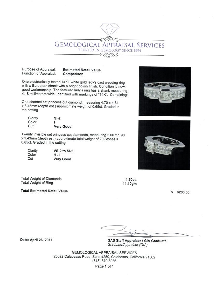 One electronically tested 14KT white gold lady's cast wedding ring with a European shank with a bright polish finish. The featured lady's ring has a shank measuring 4.18 millimeters wide. Identified with markings of '14K'. Condition is new, good workmanship. Containing: One channel set princess cut diamond, measuring 4.70 x 4.64 x 3.48mm (depth est.) approximate weight of 0.65ct. Graded in the setting. Color I Clarity SI-2 Cut Very Good Twenty invisible set princess cut diamonds, measuring 2.00 x 1.90 x 1.43mm (depth est.) approximate total weight of 20 Stones = 0.85ct. Graded in the setting. Color H - I Clarity VS-2 to SI-2 Cut Very Good. Total Weight of Diamonds 1.50ct.. Total Weight of Ring 11.10gm GAS Appraised at $6200.00. GAS Appraised at $6,200.00.