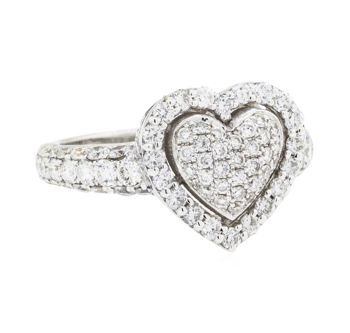 One electronically tested 14KT white gold lady's cast fashion heart shape ring with a halo with a bright polish finish. The featured lady's ring has a shank measuring 2.50 millimeters wide. Identified with markings of '14K'. Condition is new, good workmanship. Containing: Sixty-Six prong set round brilliant cut diamonds, measuring 2.00 - 1.60 x 1.12mm (depth est.) approximate total weight of 66 Stones = 1.30ct. Graded in the setting. Color H - I Clarity SI-1 to SI-3 Cut Good Thirty-One prong set round brilliant cut diamonds, measuring 1.30 - 1.20 x 0.75mm (depth est.) approximate total weight of 31 Stones = 0.20ct. Graded in the setting. Color H - I Clarity VS-2 to SI-2 Cut Good. Total Weight of Diamonds 1.50ct.. Total Weight of Ring 5.20gm GAS Appraised at $4080.00. GAS Appraised at $4,080.00.