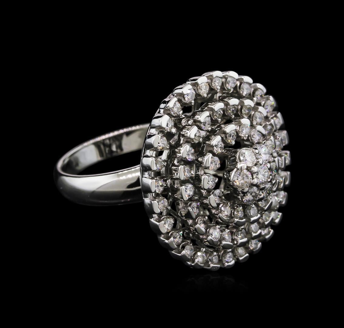 One electronically tested 14KT white gold lady's combination cast & assembled fashion ring with a bright polish finish. The featured ladies ring has three halos of diamonds with a shank measuring 3.10 millimeter in width. Identified with markings of "K14". Condition is new, good workmanship. Containing: Seven prong set round brilliant cut diamonds, measuring 2.50 - 2.45 x 1.61mm (depth est.) approximate total weight of 7 Stones = 0.40 ct. Graded in the setting. Clarity: SI-1 to I-1. Color: I - Good Sixty-Three prong set round brilliant cut diamonds, measuring 1.70 - 1.60 x 1.04mm (depth est.) approximate total weight of 63 Stones = 1.10 ct. Graded in the setting. Clarity: SI-2 to I-1. Color: I - Good. Total Weight of Diamonds 1.50 ct. Total Weight of Ring 12.00gm. GAS Appraised.