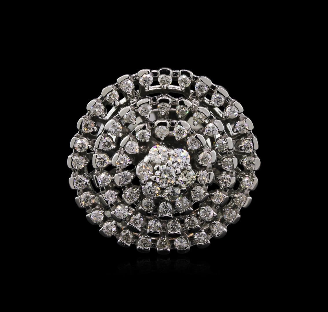 One electronically tested 14KT white gold lady's combination cast & assembled fashion ring with a bright polish finish. The featured ladies ring has three halos of diamonds with a shank measuring 3.10 millimeter in width. Identified with markings of "K14". Condition is new, good workmanship. Containing: Seven prong set round brilliant cut diamonds, measuring 2.50 - 2.45 x 1.61mm (depth est.) approximate total weight of 7 Stones = 0.40 ct. Graded in the setting. Clarity: SI-1 to I-1. Color: I - Good Sixty-Three prong set round brilliant cut diamonds, measuring 1.70 - 1.60 x 1.04mm (depth est.) approximate total weight of 63 Stones = 1.10 ct. Graded in the setting. Clarity: SI-2 to I-1. Color: I - Good. Total Weight of Diamonds 1.50 ct. Total Weight of Ring 12.00gm. GAS Appraised.