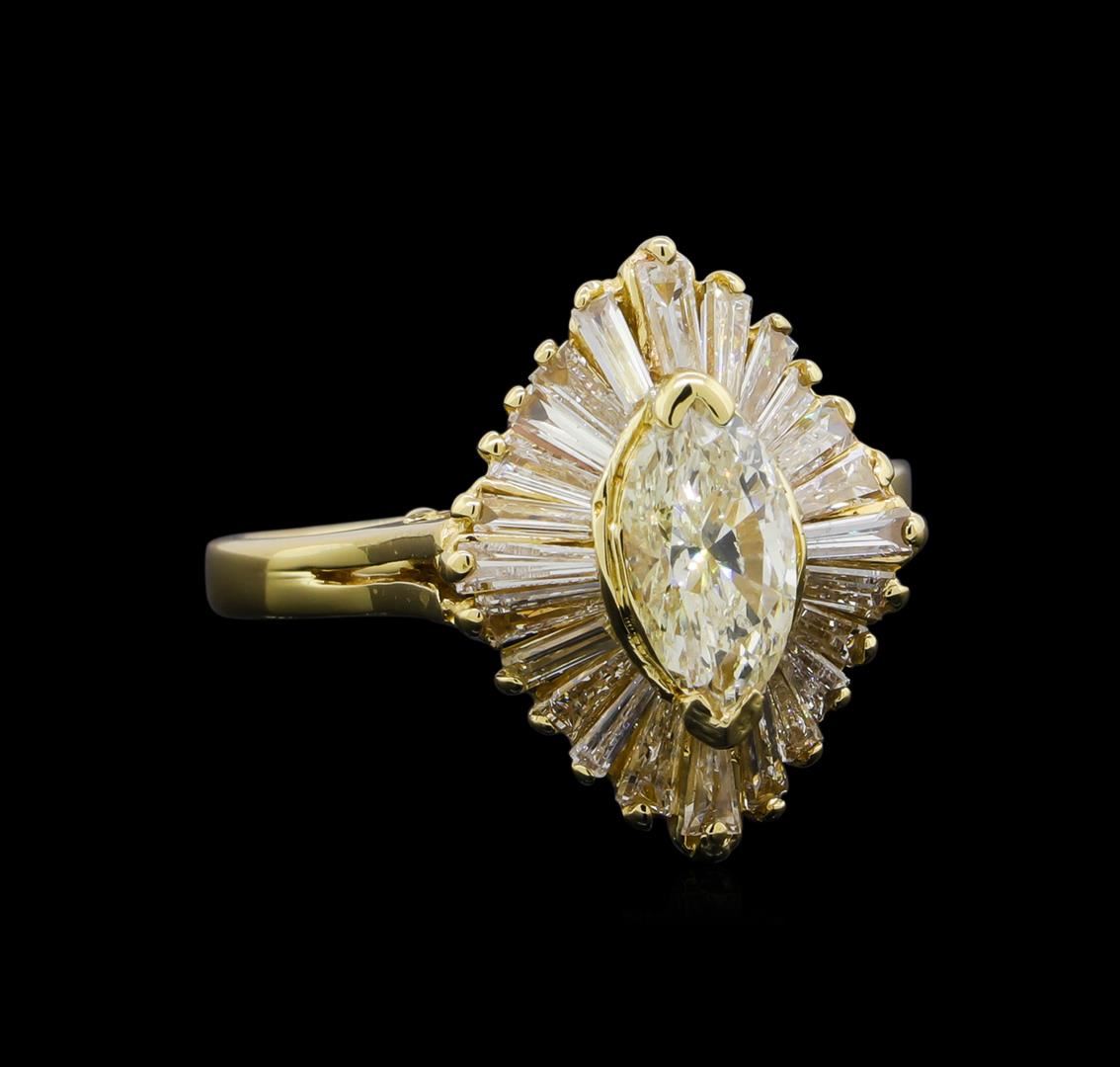 One electronically tested 14KT yellow gold ladies cast diamond ring with a bright polish finish. The ballerina style ring features a center marquise cut diamond set within a radiating diamond bezel supported by a ribbed under gallery and split shoulders, completed by a one and one-half millimeter wide bezel. Identified with markings of "14K". Condition is good. Containing: One prong set marquise shaped cut diamond, measuring 8.80 x 4.50 x 3.50mm (depth est.) approximate weight of 0.80ct with a strong blue fluorescence. Naturally occurring internal & external characteristics are present, including surface reaching features and cavities. Graded in the setting. Clarity: SI-2. Color: K. Depth 77.8%. Table 57.8%. Twenty-Four prong set baguette cut (tapered) diamonds, measuring from 3.20 x 1.00 x 0.70mm (depth est.) to 3.70 x 1.30 x 0.91mm (depth est.) approximate total weight of 24 Stones = 0.70ct. The clarity grade reflects the entire range of clarity for this group. Graded in the setting. Clarity: VS-2 to I-1. Color: G - I. Total Weight of Diamonds 1.50ct. Total Weight of Ring 4.17gm. AIG Appraised at $7,105.00.