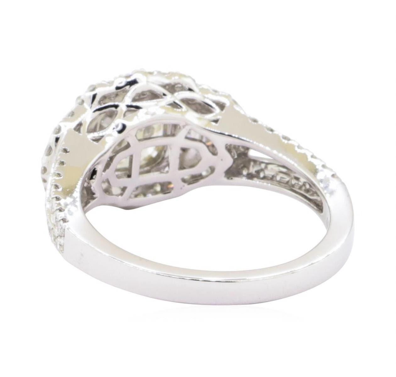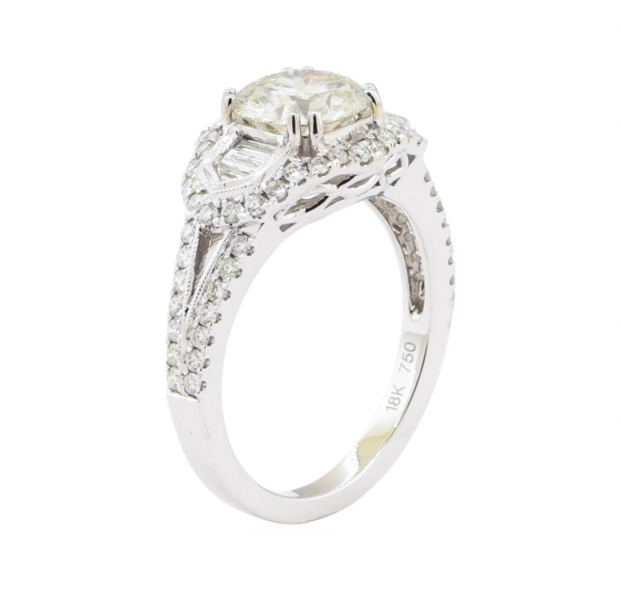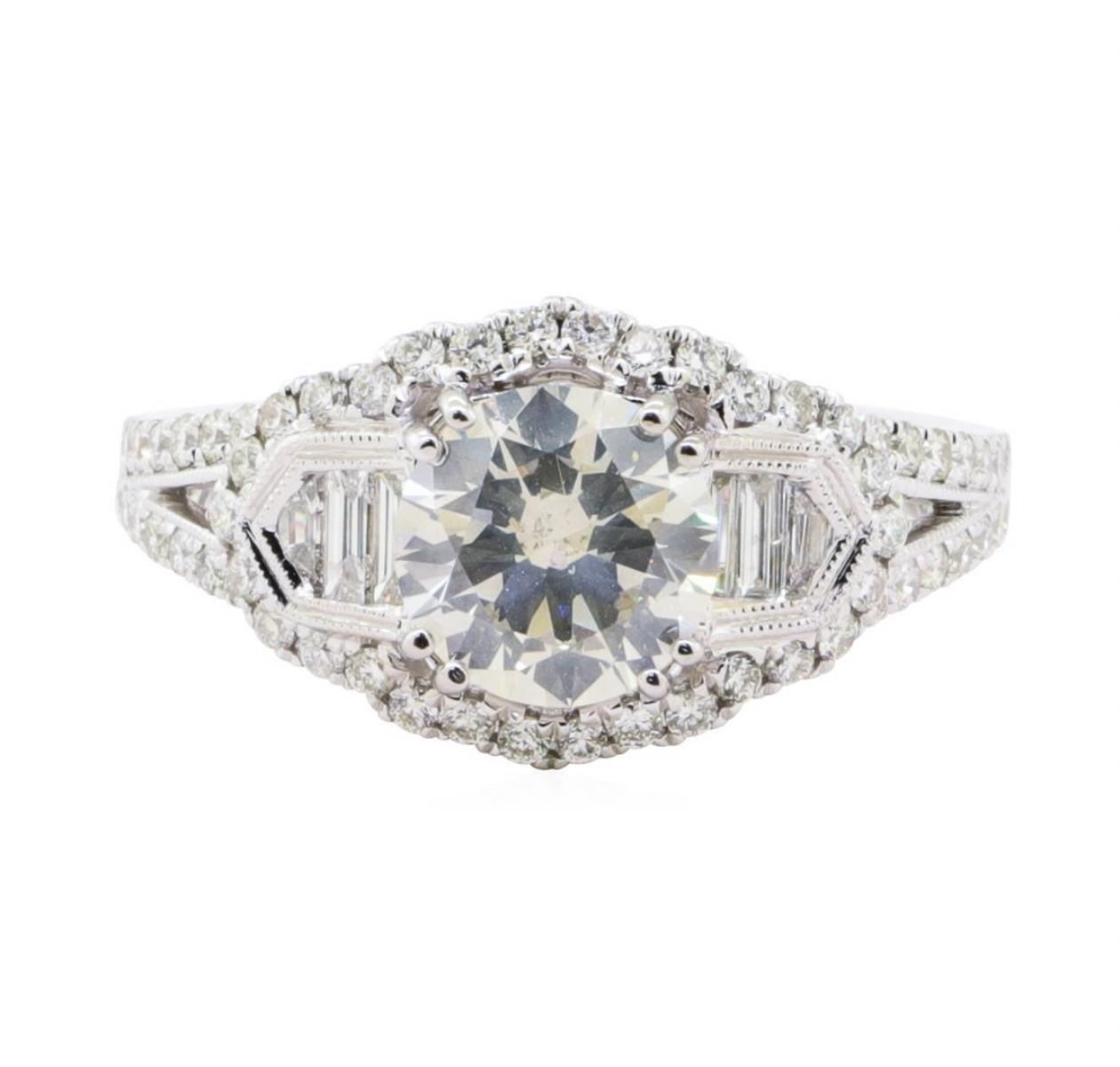 One stamped & electronically tested 18KT white gold ladies cast diamond ring. The featured diamond is set within a floral design diamond bezel, supported by an elaborate lattice under gallery and diamond set shoulders, completed by a two millimeter wide band. Bright polish finish with milgrain detailing throughout. Trademark is UCG. Identified with markings of "18K 750". Condition is new, good workmanship. Containing: One prong set round brilliant cut diamond, measuring 7.54 - 7.48 x 4.38mm exact weight 1.50 ct. Graded loose prior to setting in the EGL Laboratory, Report #US917731015D. The EGL Report is attached. Clarity SI-2 Color J Six channel set baguette cut diamonds, measuring from 3.00 x 1.50 x 1.28mm (depth est.) to 3.50 x 1.20 x 1.02mm (depth est.) approximate total weight of 6 Stones = 0.20 ct. Graded in the setting. Clarity SI-1 to I-1 Color F - H Fifty-Eight bead set round brilliant cut diamonds, measuring 1.30 - 1.30 x 0.78mm (depth est.) approximate total weight of 58 Stones = 0.47ct. Graded in the setting. Clarity SI-1 to I-1 Color F - H Total Weight of Diamonds 2.17 ct. Total Weight of Ring 4.97 gm Estimated Retail Value $ 30,900.00 US