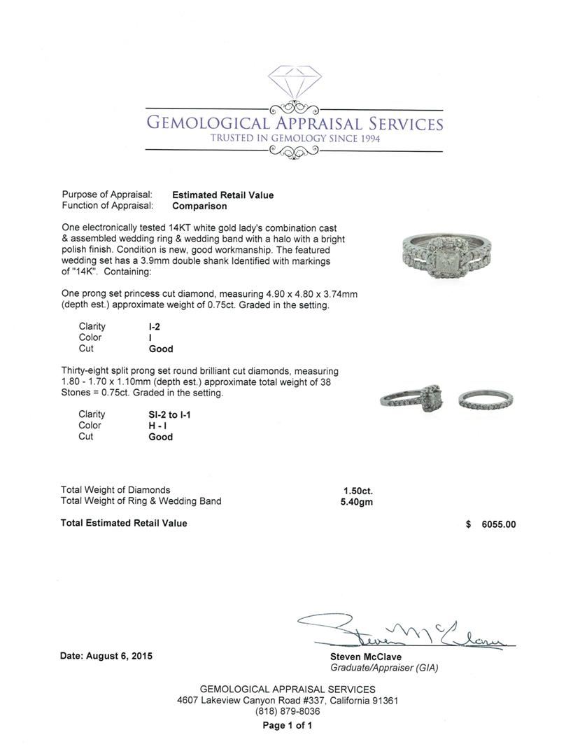 One electronically tested 14KT white gold lady's combination cast & assembled wedding ring & wedding band with a halo with a bright polish finish. The featured wedding set has a 3.9mm double shank Identified with markings of "14K". Condition is new, good workmanship. Containing: One prong set princess cut diamond, measuring 4.90 x 4.80 x 3.74mm (depth est.) approximate weight of 0.75ct. Graded in the setting. Clarity: I-2. Color: I. Cut Good Thirty-Eight split prong set round brilliant cut diamonds, measuring 1.80 - 1.70 x 1.10mm (depth est.) approximate. Total Weight of 38 Stones = 0.75ct. Graded in the setting. Clarity: SI-2 to I-1. Color: H - I. Cut Good. Total Weight of Diamonds 1.50ct. Total Weight of Ring & Wedding Band 5.40gm. GAS Appraised at $6,055.00.