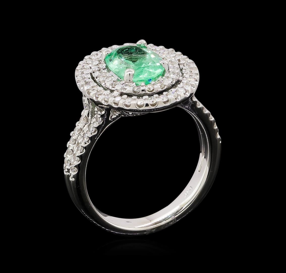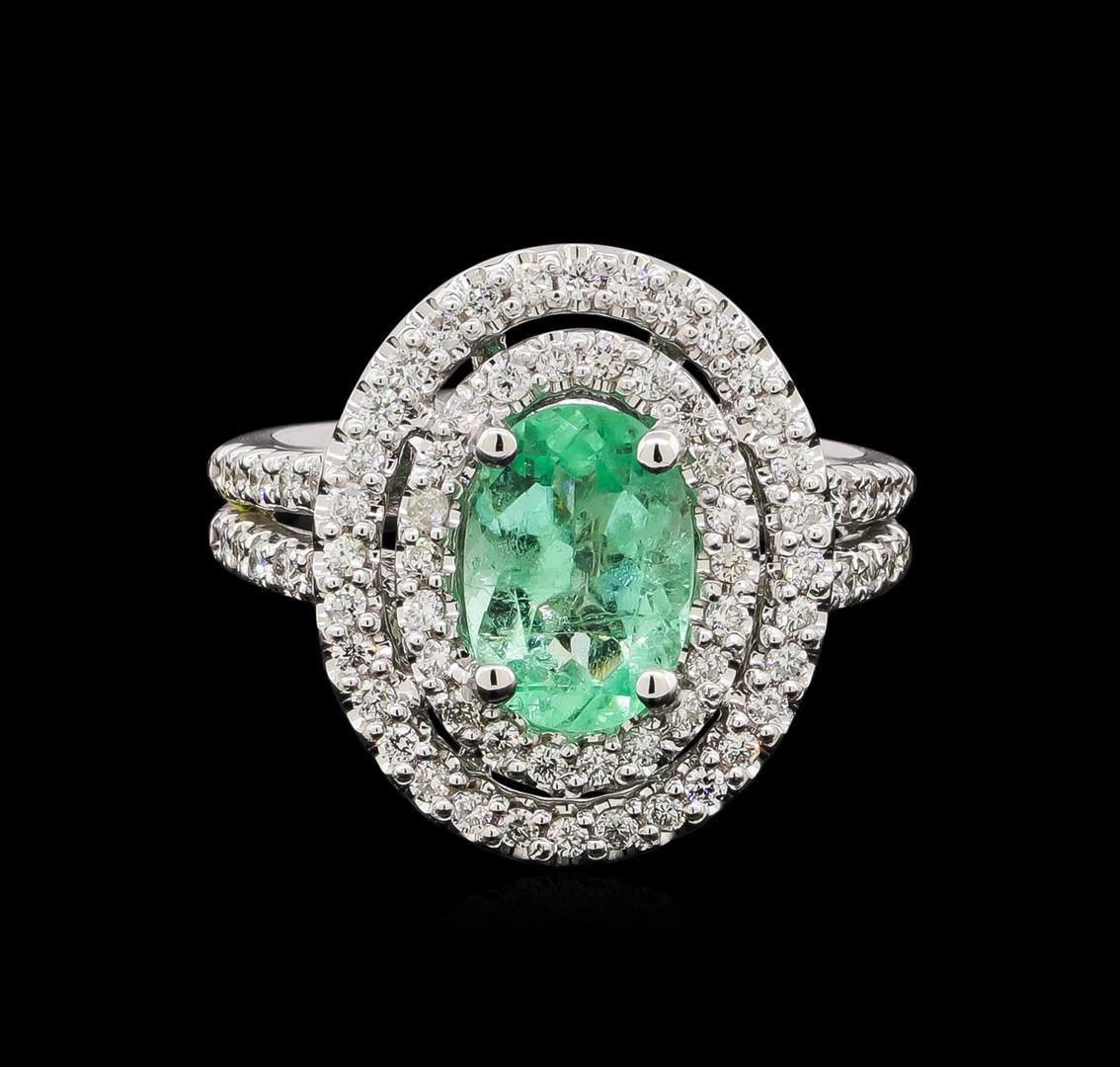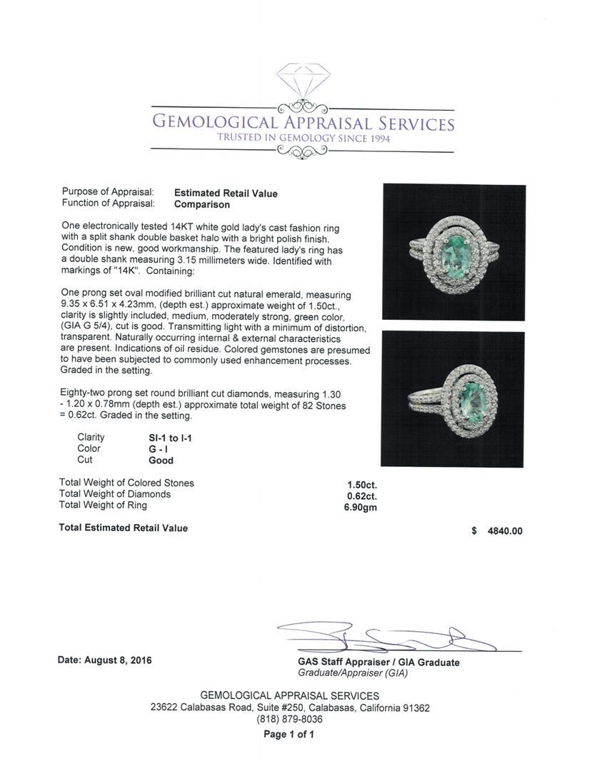 One electronically tested 14KT white gold lady's cast fashion ring with a split shank double basket halo with a bright polish finish. The featured lady's ring has a double shank measuring 3.15 millimeters wide. Identified with markings of '14K'. Condition is new, good workmanship. Containing: One prong set oval modified brilliant cut natural emerald, measuring 9.35 x 6.51 x 4.23mm, (depth est.) approximate weight of 1.50ct., clarity is slightly included, medium, moderately strong, green color, (GIA G 5/4), cut is good. Transmitting light with a minimum of distortion, transparent. Naturally occurring internal & external characteristics are present. Indications of oil residue. Colored gemstones are presumed to have been subjected to commonly used enhancement processes. Graded in the setting. Eighty-Two prong set round brilliant cut diamonds, measuring 1.30 - 1.20 x 0.78mm (depth est.) approximate total weight of 82 Stones = 0.62ct. Graded in the setting. Clarity SI-1 to I-1. Color: G - I Cut Good. Total Weight of Colored Stones 1.50ct.. Total Weight of Diamonds 0.62ct.. Total Weight of Ring 6.90gm. GAS Appraised at $4,840.00.
