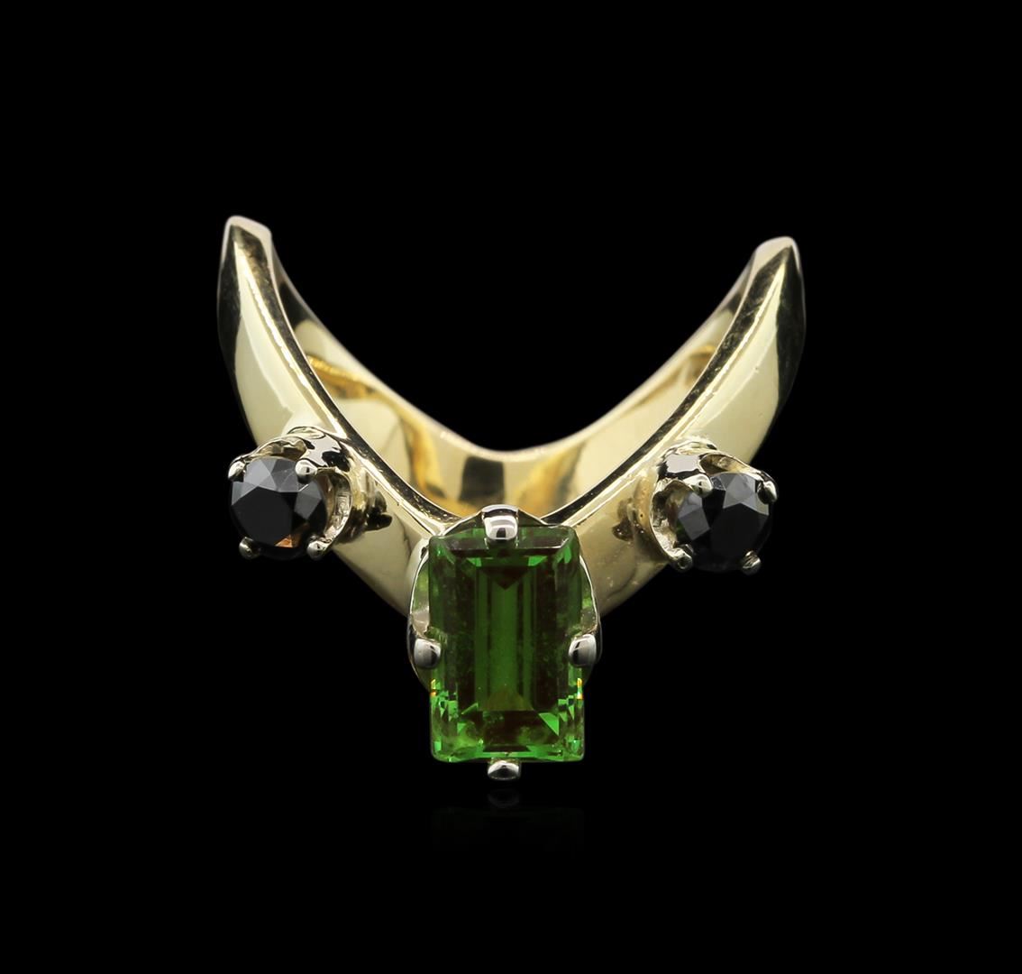One ring featuring: 14KT yellow gold weighing 6.20 grams containing one prong set radiant cut green amethyst center stone with a total weight of 1.50ct and prong set round black diamonds with a total weight of 0.42ct.