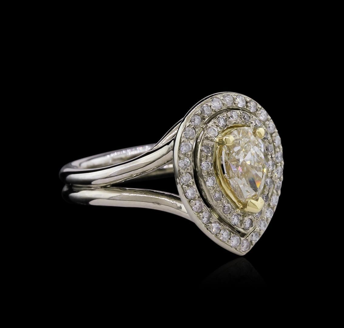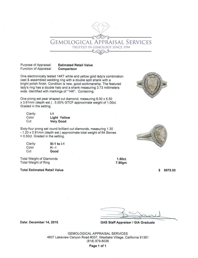 One electronically tested 14KT white and yellow gold lady's combination cast & assembled wedding ring with a double split shank with a bright polish finish. The featured lady's ring has a double halo and a shank measuring 3.73 millimeters wide. Identified with markings of "14K". Condition is new, good workmanship. Containing: One prong set pear shaped cut diamond, measuring 8.00 x 5.50 x 3.61mm (depth est.) , 5.00.%. GTCF approximate weight of 1.00 ct. Graded in the setting. Clarity: I-1 Cut Very Good Sixty-Four prong set round brilliant cut diamonds, measuring 1.30 - 1.20 x 0.81mm (depth est.) approximate total weight of 64 Stones = 0.50 ct. Graded in the setting. Clarity: SI-1 to I-1. Color: H - I. Cut Good. Total Weight of Diamonds 1.50 ct. Total Weight of Ring 7.90gm. GAS Appraised.