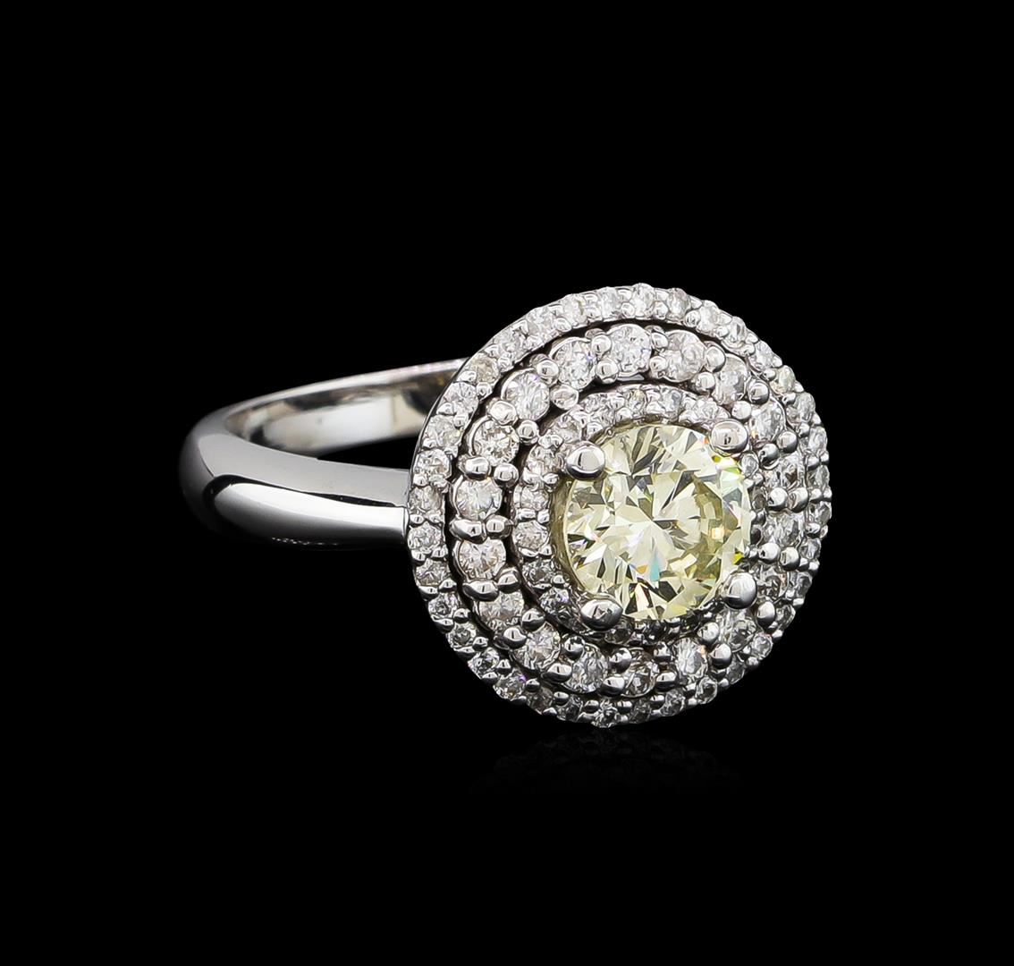 One electronically tested 14KT white gold ladies cast diamond unity ring with a bright polish finish. The featured diamond is set within tiered diamond bezels supported by an elaborate lattice under gallery, completed by a two millimeter wide band. Identified with markings of "K14". Condition is new, good workmanship. Containing: One prong set round brilliant cut diamond, measuring 6.34 - 6.30 x 3.86mm exact weight 1.01ct. Brown secondary color throughout. Measured loose prior to setting. Graded in the setting. Clarity: VS-2. Depth: 61.1%. Table 61.0%. Pavil. Depth%. 42.0%. Eighteen prong set round brilliant cut diamonds, measuring 1.50 - 1.50 x 0.90mm (depth est.) approximate total weight of 18 Stones = 0.24ct. Graded in the setting. Clarity: SI-2 to I-2. Color: G - H Fifty-Six prong set round brilliant cut diamonds, measuring 1.00 - 1.00 x 0.60mm (depth est.) approximate total weight of 56 Stones = 0.25ct. Graded in the setting. Clarity: SI-2 to I-2. Color: G - I. Total Weight of Diamonds 1.50ct. Total Weight of Ring 6.32gm. AIG Appraised at $11,205.00.