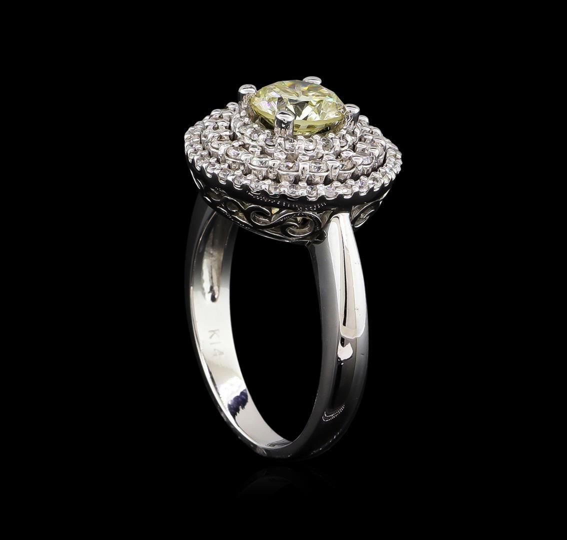 One electronically tested 14KT white gold ladies cast diamond unity ring with a bright polish finish. The featured diamond is set within tiered diamond bezels supported by an elaborate lattice under gallery, completed by a two millimeter wide band. Identified with markings of "K14". Condition is new, good workmanship. Containing: One prong set round brilliant cut diamond, measuring 6.34 - 6.30 x 3.86mm exact weight 1.01ct. Brown secondary color throughout. Measured loose prior to setting. Graded in the setting. Clarity: VS-2. Depth: 61.1%. Table 61.0%. Pavil. Depth%. 42.0%. Eighteen prong set round brilliant cut diamonds, measuring 1.50 - 1.50 x 0.90mm (depth est.) approximate total weight of 18 Stones = 0.24ct. Graded in the setting. Clarity: SI-2 to I-2. Color: G - H Fifty-Six prong set round brilliant cut diamonds, measuring 1.00 - 1.00 x 0.60mm (depth est.) approximate total weight of 56 Stones = 0.25ct. Graded in the setting. Clarity: SI-2 to I-2. Color: G - I. Total Weight of Diamonds 1.50 ct. Total Weight of Ring 6.32gm. AIG Appraised.