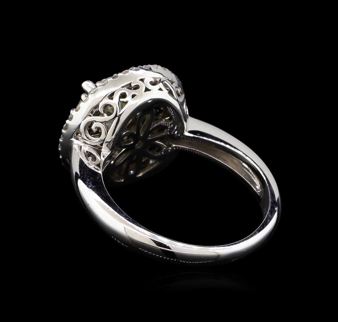 One electronically tested 14KT white gold ladies cast diamond unity ring with a bright polish finish. The featured diamond is set within tiered diamond bezels supported by an elaborate lattice under gallery, completed by a two millimeter wide band. Identified with markings of "K14". Condition is new, good workmanship. Containing: One prong set round brilliant cut diamond, measuring 6.34 - 6.30 x 3.86mm exact weight 1.01ct. Brown secondary color throughout. Measured loose prior to setting. Graded in the setting. Clarity: VS-2. Depth: 61.1%. Table 61.0%. Pavil. Depth%. 42.0%. Eighteen prong set round brilliant cut diamonds, measuring 1.50 - 1.50 x 0.90mm (depth est.) approximate total weight of 18 Stones = 0.24ct. Graded in the setting. Clarity: SI-2 to I-2. Color: G - H Fifty-Six prong set round brilliant cut diamonds, measuring 1.00 - 1.00 x 0.60mm (depth est.) approximate total weight of 56 Stones = 0.25ct. Graded in the setting. Clarity: SI-2 to I-2. Color: G - I. Total Weight of Diamonds 1.50 ct. Total Weight of Ring 6.32gm. AIG Appraised.