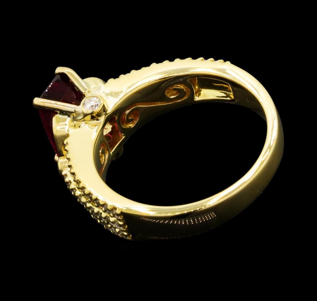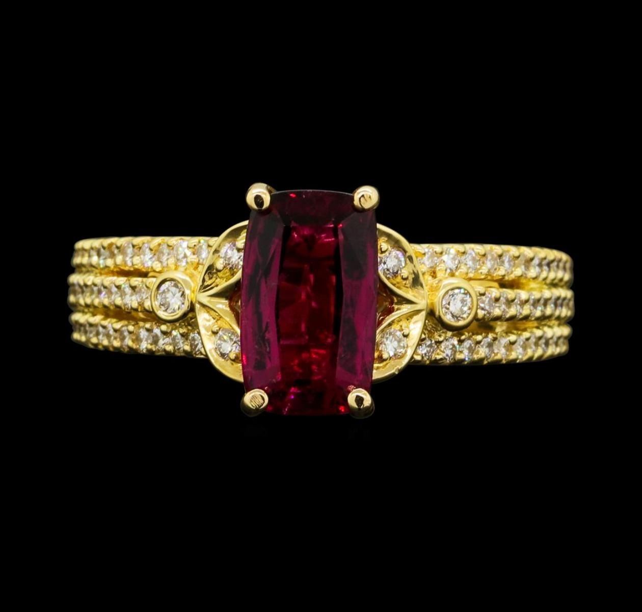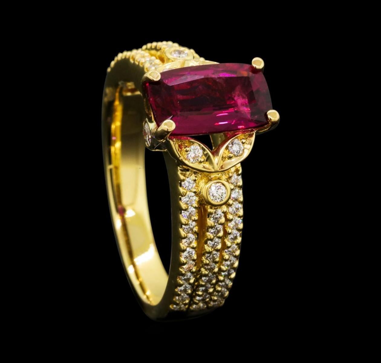 One electronically tested 18KT yellow gold lady's cast fashion ring with a three row wide split shank with a bright polish finish. The featured lady's ring has a shank measuring 2.90 millimeters wide. Identified with markings of '18K'. Condition is new, good workmanship. Containing: One prong set rectangular cushion modified brilliant cut natural pink tourmaline, measuring 9.52 x 5.80 x 4.00mm, (depth est.) approximate weight of 1.50 ct., clarity is slightly included, medium, strong, strongly purplish red color, (GIA stpR 5/5), cut is very good. Transmitting light with a minimum of distortion, transparent. Colored gemstones are presumed to have been subjected to commonly used enhancement processes. Graded in the setting. Eight prong set round brilliant cut diamonds, measuring 1.60 - 1.50 x 0.96mm (depth est.) approximate total weight of 8 Stones = 0.11ct. Graded in the setting. Color G - H Clarity VS-1 to VS-2 Cut Very Good Sixty-Two prong set round brilliant cut diamonds, measuring 1.20 - 1.15 x 0.73mm (depth est.) approximate total weight of 62 Stones = 0.39ct. Graded in the setting. Color G - I Clarity VS-1 to VS-2 Cut Very Good. Total Weight of Colored Stones 1.50 ct.. Total Weight of Diamonds 0.50 ct.. Total Weight of Ring 7.70gm. GAS Appraised.