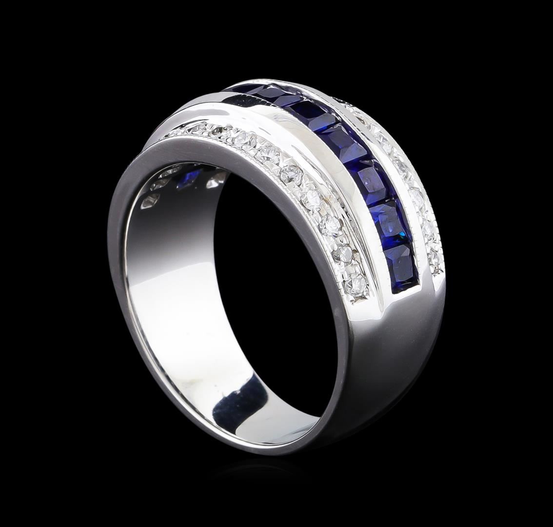 One electronically tested 18KT white gold lady's cast fashion ring with a tapered shank with a bright polish with milgrain detailing finish. The featured lady's ring has a shank measuring 6.25 millimeters wide. Condition is new, good workmanship. Containing: Ten channel set princess modified brilliant cut natural blue sapphires, measuring 3.00 x 2.70 x 1.89mm, approximate total weight of 1.50ct., clarity is eye clean, type II, medium dark, moderately strong, blue color, (GIA B 6/4), cut is very good. Transmitting light with no distortion, transparent. Colored gemstones are presumed to have been subjected to commonly used enhancement processes. Graded in the setting. Twenty-Six bead set round brilliant cut diamonds, measuring 1.60 - 1.50 x 0.97mm (depth est.) approximate total weight of 26 Stones = 0.37ct. Graded in the setting. Clarity: VS-2 to SI-2. Color: G - Good. Total Weight of Colored Stones 1.50ct. Total Weight of Diamonds 0.37ct. Total Weight of Ring 11.50gm. GAS Appraised at $4,550.00.