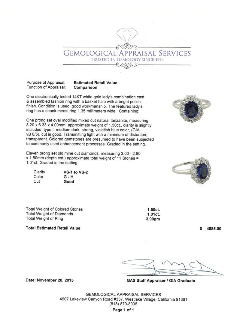 One electronically tested 14KT white gold lady's combination cast & assembled fashion ring with a basket halo with a bright polish finish. The featured lady's ring has a shank measuring 1.35 millimeters wide. Condition is used, good workmanship. Containing: One prong set oval modified mixed cut natural tanzanite, measuring 8.20 x 6.33 x 4.00mm, approximate weight of 1.50ct., clarity is slightly included, type I, medium dark, strong, violetish blue color, (GIA vB 6/5), cut is good. Transmitting light with a minimum of distortion, transparent. Colored gemstones are presumed to have been subjected to commonly used enhancement processes. Graded in the setting. Eleven prong set old mine cut diamonds, measuring 3.00 - 2.80 x 1.80mm (depth est.) approximate total weight of 11 Stones = 1.01ct. Graded in the setting. Clarity: VS-1 to VS-2. Color: G - Good. Total Weight of Colored Stones 1.50ct. Total Weight of Diamonds 1.01ct. Total Weight of Ring 3.90gm. GAS Appraised at $4,885.00.