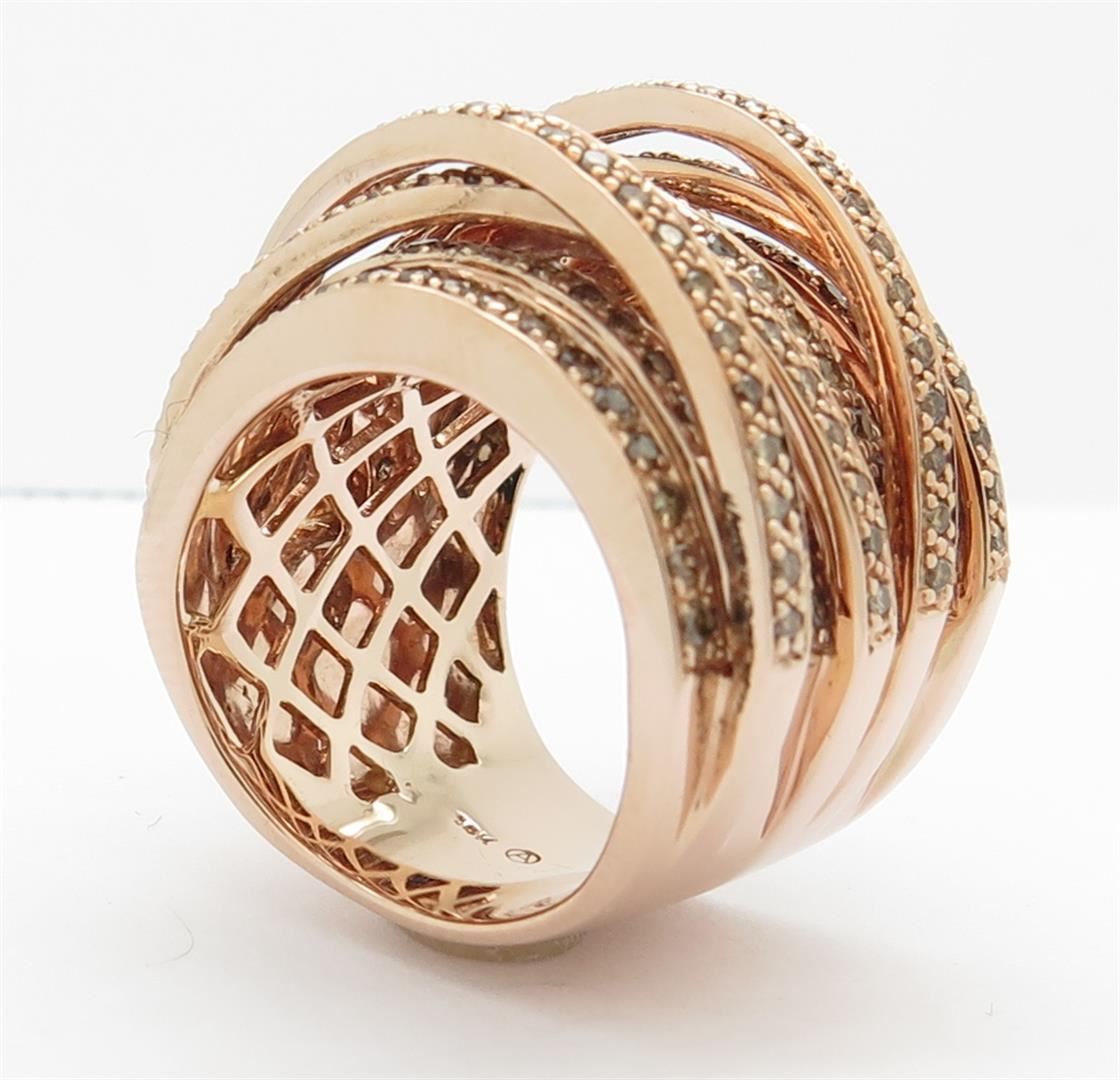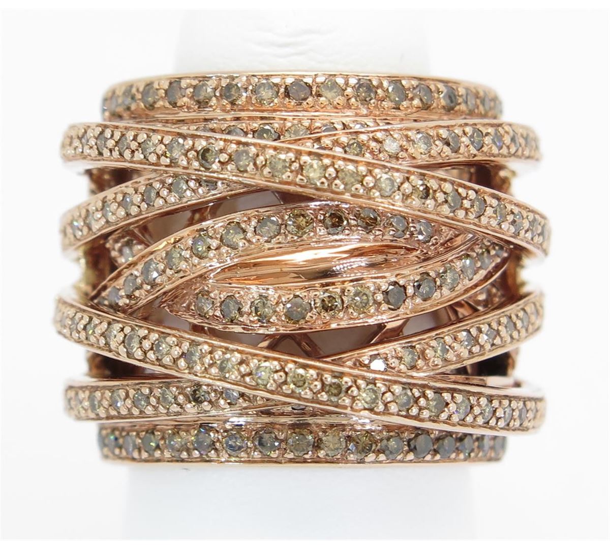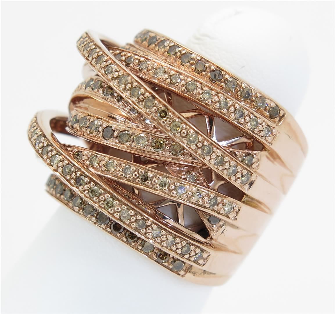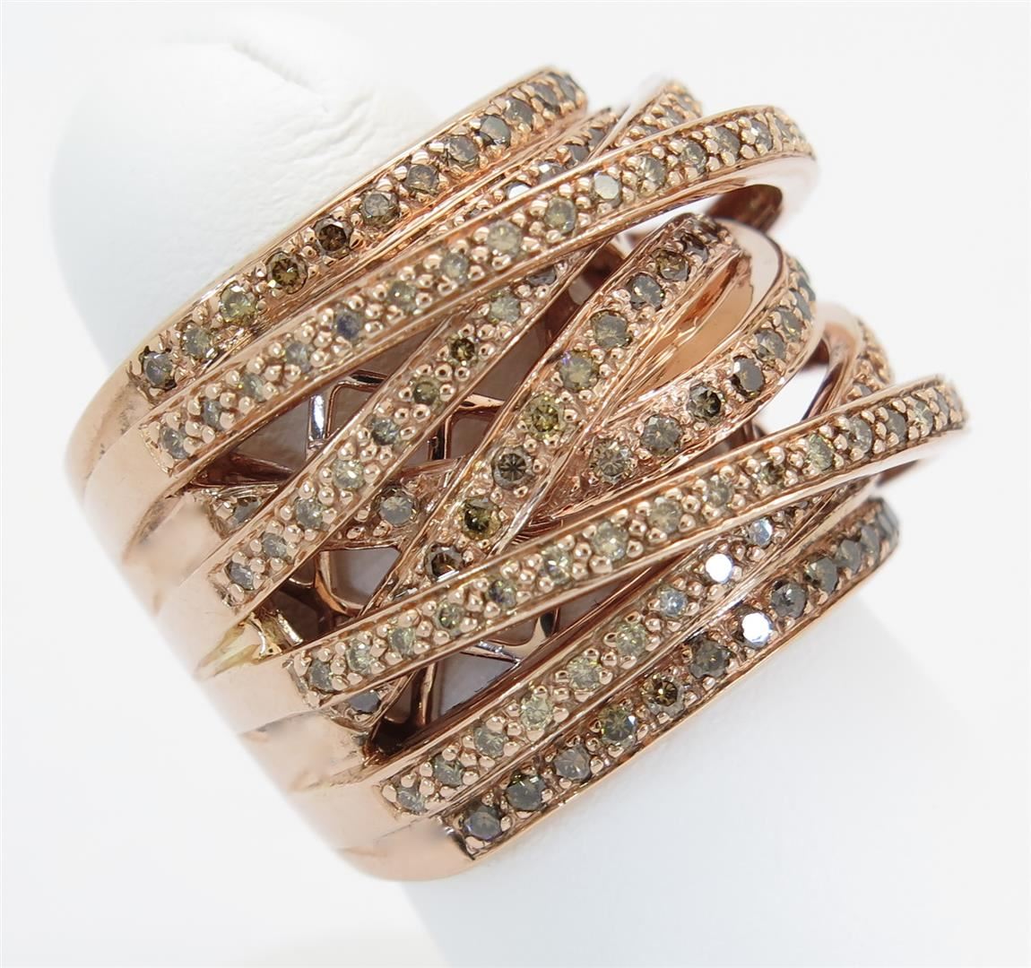 One tested 14K rose gold diamond ring. Containing: 187 Round Brilliant Cut Diamonds. Clarity: I-SI, Color: chocolate. Approximate total diamond weight: 1.50CTW. Diamonds are graded in the mounting, unless otherwise stated. Weight of ring: 20.6 grams. Size: 5.5.