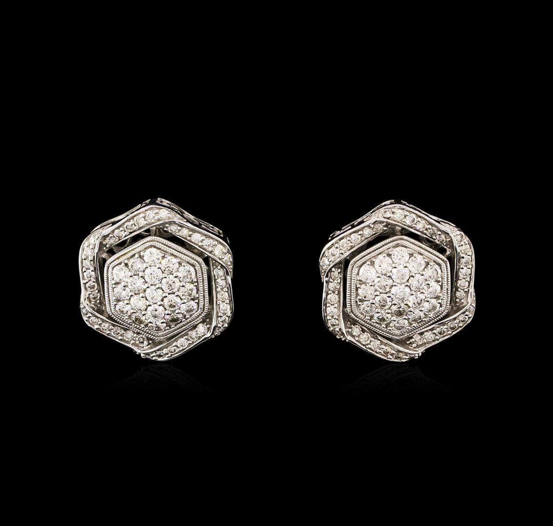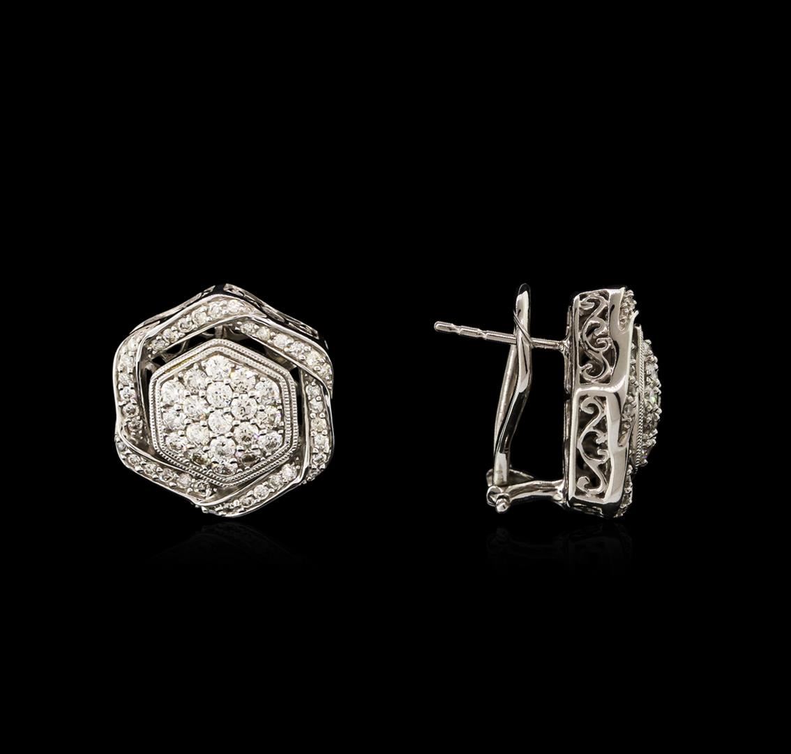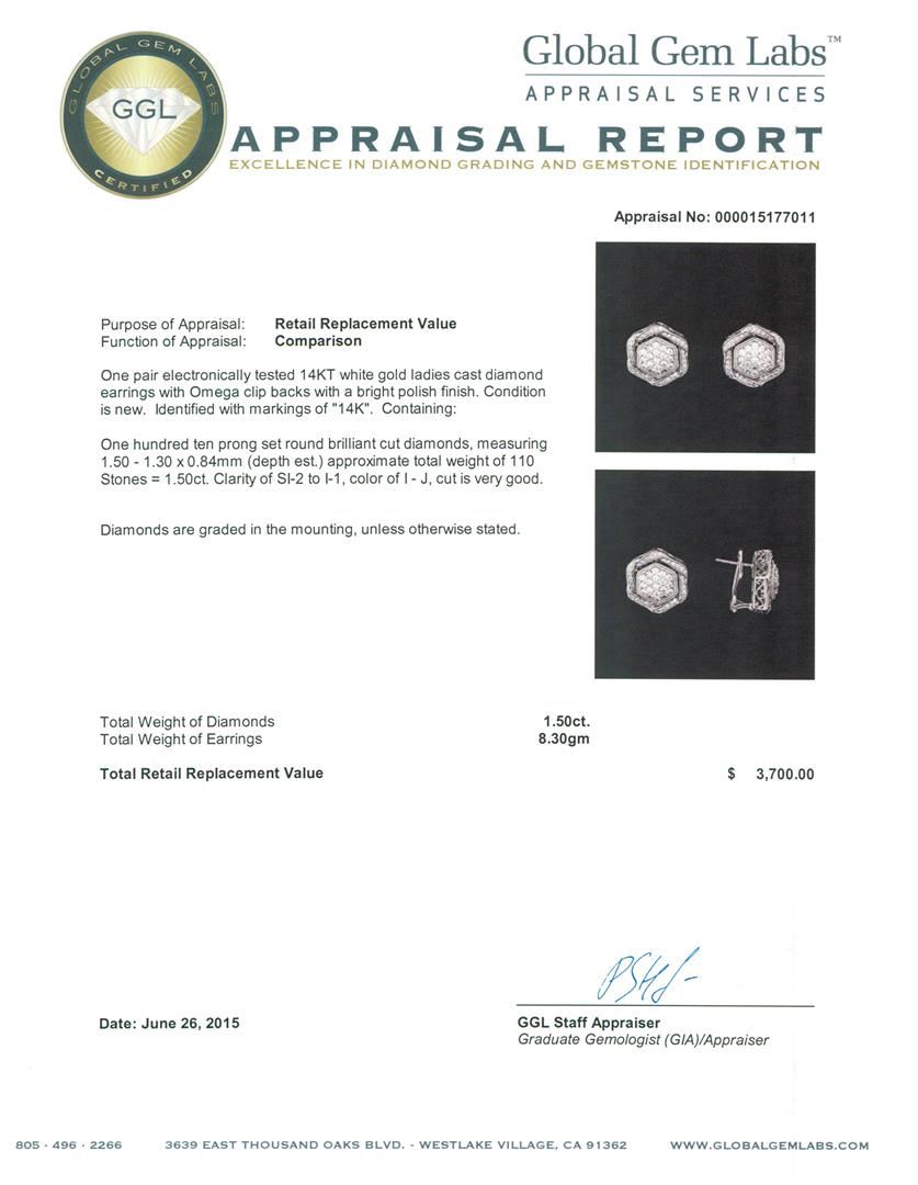 One pair electronically tested 14KT white gold ladies cast diamond earrings with Omega clip backs with a bright polish finish. Identified with markings of "14K". Condition is new. Containing: One Hundred Ten prong set round brilliant cut diamonds, measuring 1.50 - 1.30 x 0.84mm (depth est.) approximate total weight of 110 Stones = 1.50ct. Clarity: SI-2 to I-1. Color: I - J, Cut is Very Good. Diamonds are graded in the mounting, unless otherwise stated. Total Weight of Diamonds 1.50ct. Total Weight of Earrings 8.30 grams. GGL Appraised at $3,700.00.