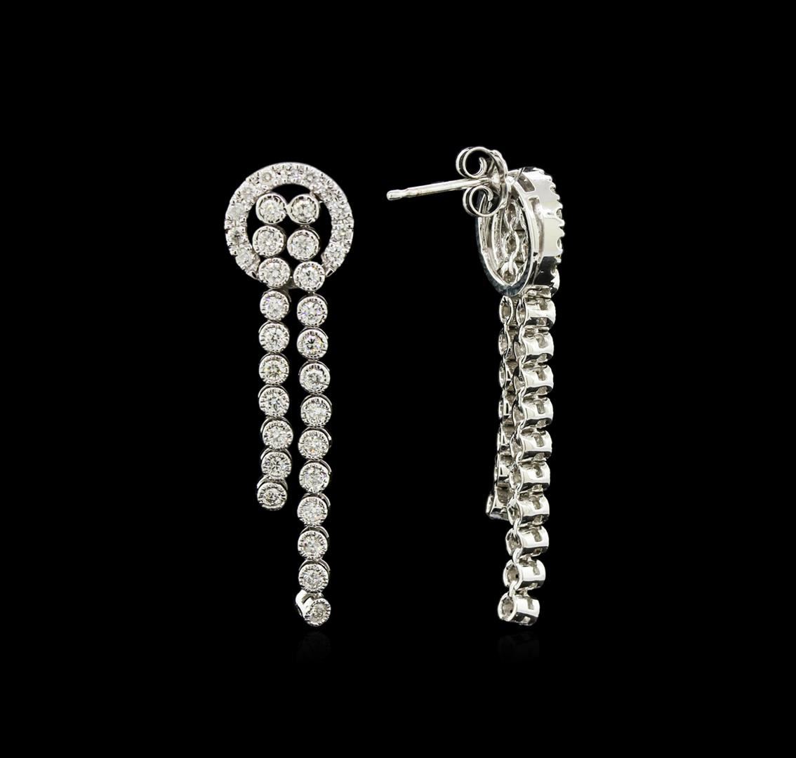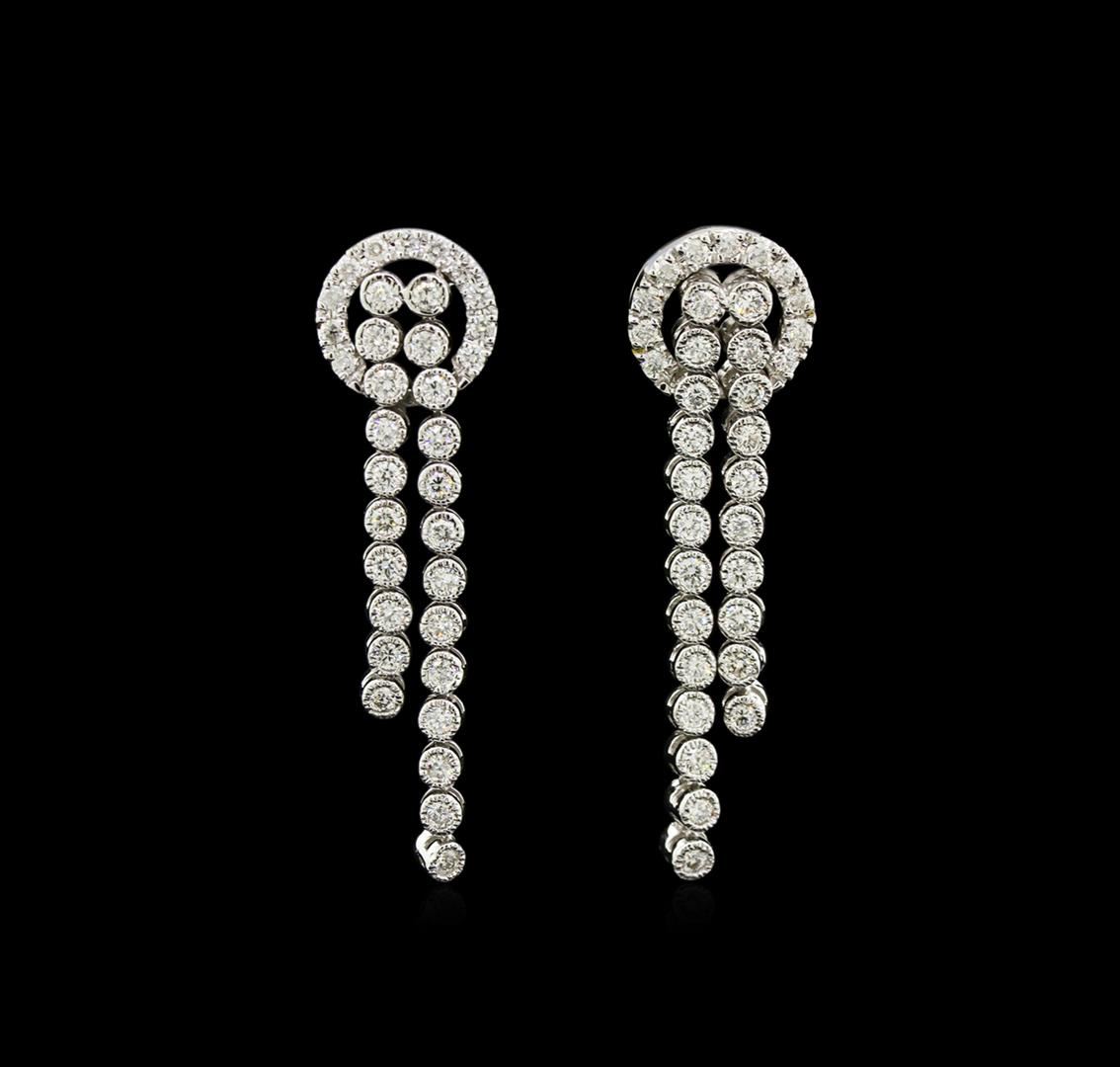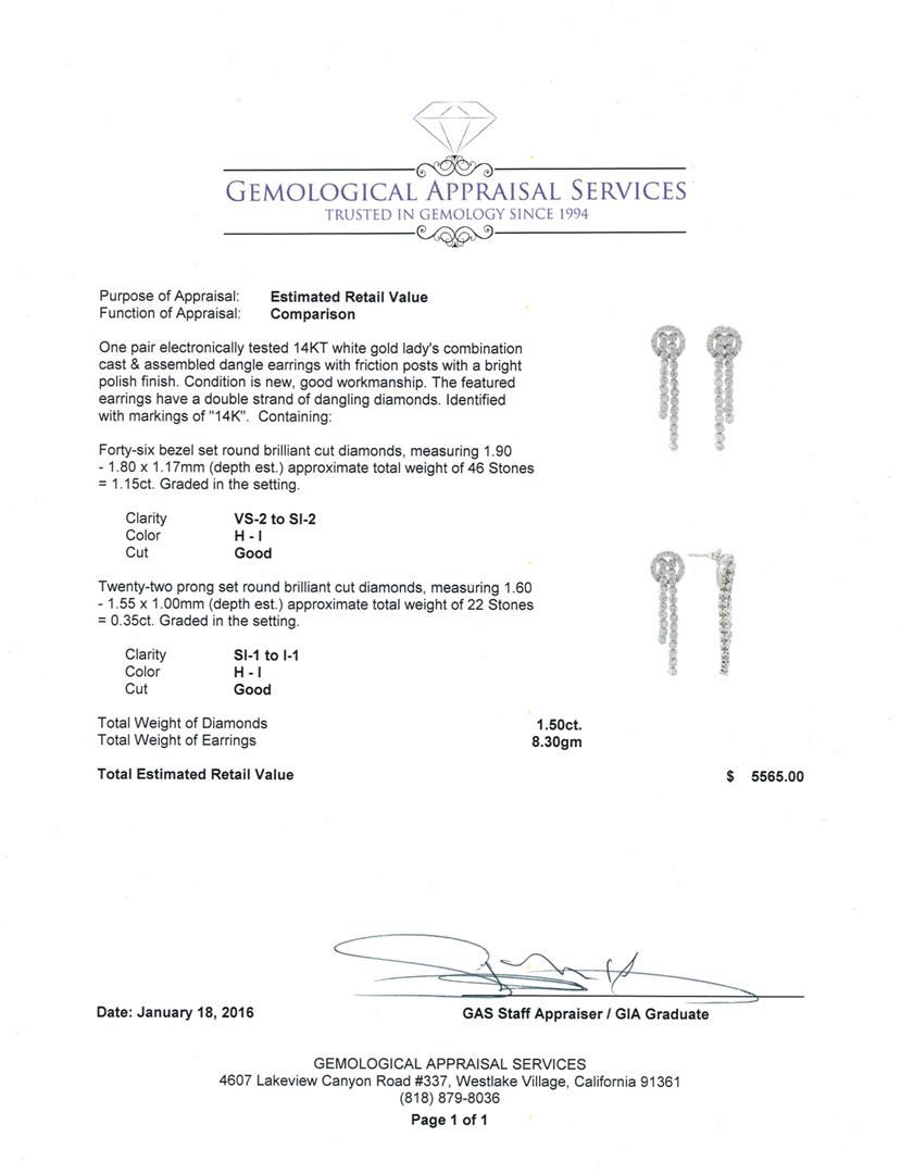 One pair electronically tested 14KT white gold lady's combination cast & assembled dangle earrings with friction posts with a bright polish finish. The featured earrings have a double strand of dangling diamonds. Identified with markings of "14K". Condition is new, good workmanship. Containing: Forty-Six bezel set round brilliant cut diamonds, measuring 1.90 - 1.80 x 1.17mm (depth est.) approximate total weight of 46 Stones = 1.15ct. Graded in the setting. Clarity: VS-2 to SI-2. Color: H - I. Cut Good Twenty-Two prong set round brilliant cut diamonds, measuring 1.60 - 1.55 x 1.00mm (depth est.) approximate total weight of 22 Stones = 0.35ct. Graded in the setting. Clarity: SI-1 to I-1. Color: H - I. Cut Good. Total Weight of Diamonds 1.50ct. Total Weight of Earrings 8.30gm. GAS Appraised at $5,565.00.