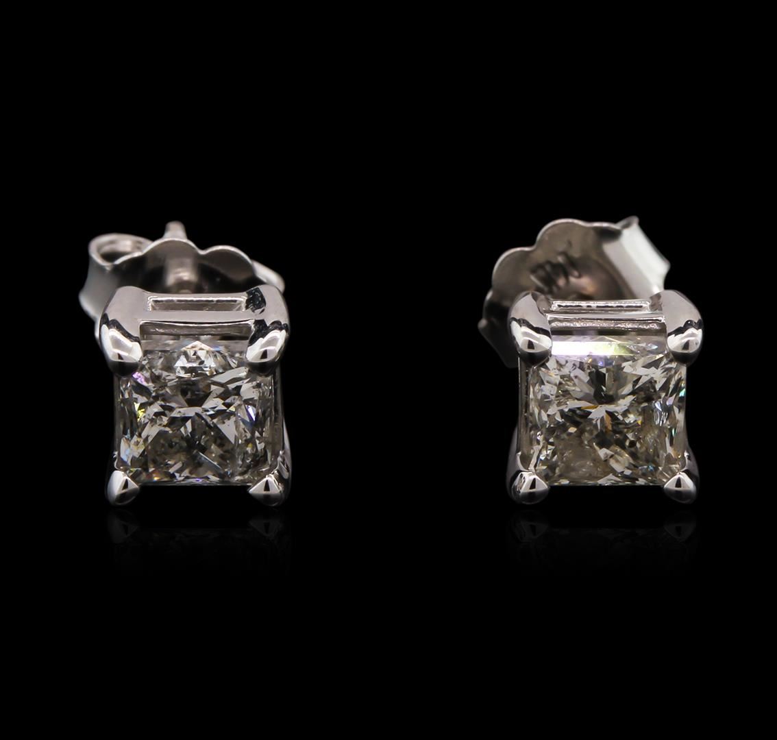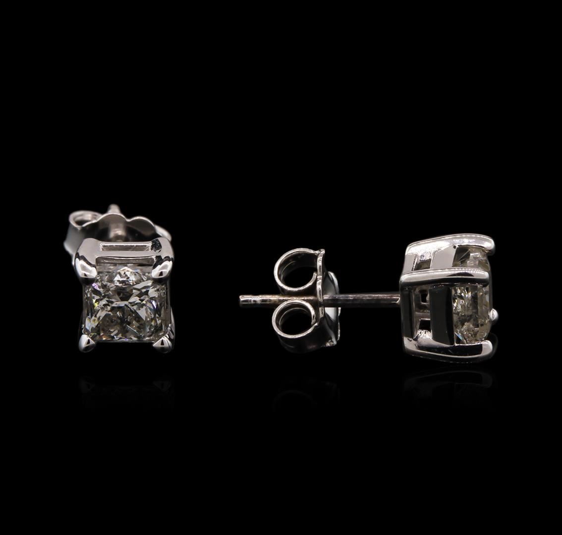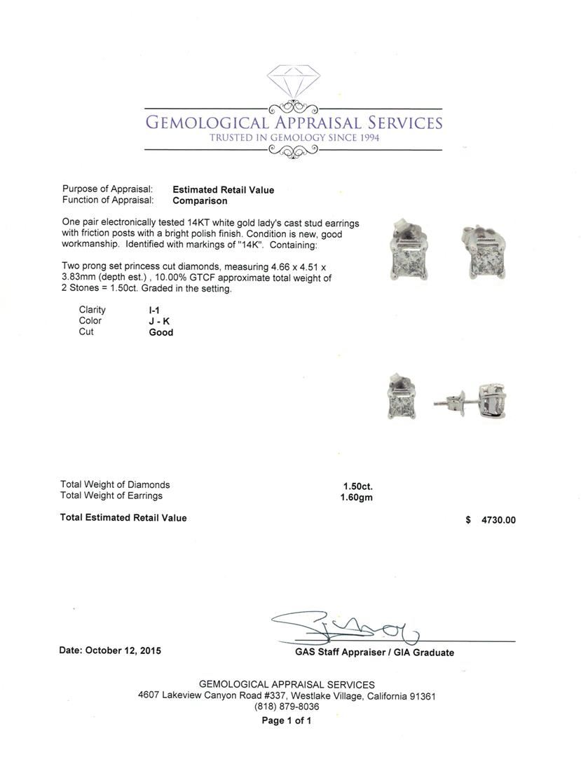 One pair electronically tested 14KT white gold lady's cast stud earrings with friction posts with a bright polish finish. Identified with markings of "14K". Condition is new, good workmanship. Containing: Two prong set princess cut diamonds, measuring 4.66 x 4.51 x 3.83mm (depth est.) , 10.00.%. GTCF approximate total weight of 2 Stones = 1.50ct. Graded in the setting. Clarity: I-1. Color: J - Good. Total Weight of Diamonds 1.50ct. Total Weight of Earrings 1.60gm. GAS Appraised at $4,730.00.