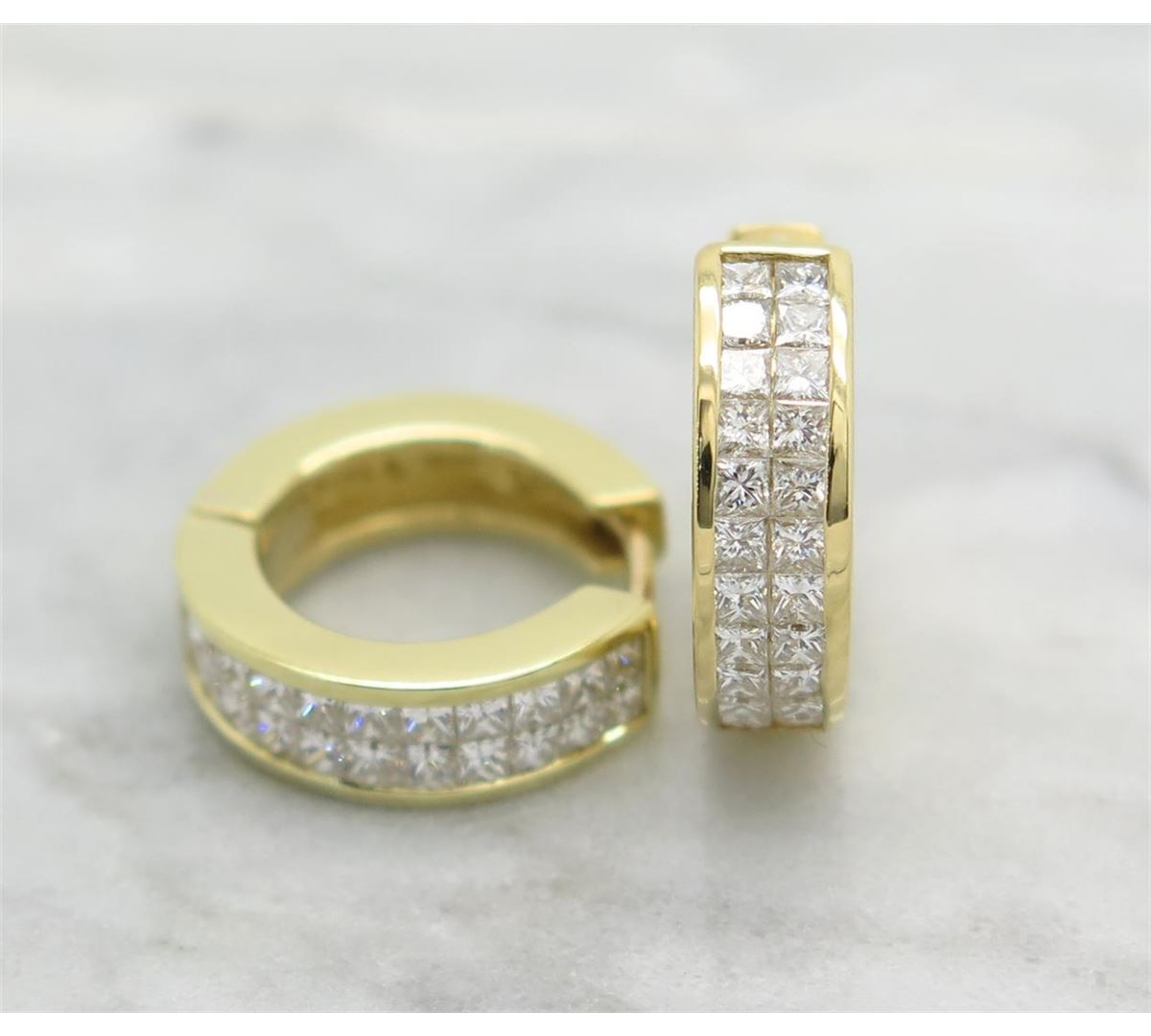 One tested pair of 18k yellow gold diamond earrings. Containing: Forty Princess cut diamonds. Approximate weight: 1.50CT, Clarity: VS-SI, Color: G-I. Diamonds are graded in the mounting, unless otherwise stated. Weight of earrings: 9.5 grams.