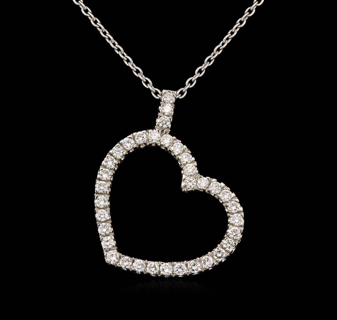 One electronically tested platinum ladies cast diamond heart pendant and chain 16.0" long, with a lobster claw clasp with a bright polish finish. Identified with markings of "PLAT". Condition is new. Containing: Thirty-Five prong set round brilliant cut diamonds, measuring 2.20 - 2.20 x 1.32mm (depth est.) approximate total weight of 35 Stones = 1.50ct. Clarity: SI-1. Color: I - J, Cut is Good. Diamonds are graded in the mounting, unless otherwise stated. Total Weight of Diamonds 1.50ct. Total Weight of Heart Pendant And Chain 11.90 grams. GGL Appraised at $5,320.00.