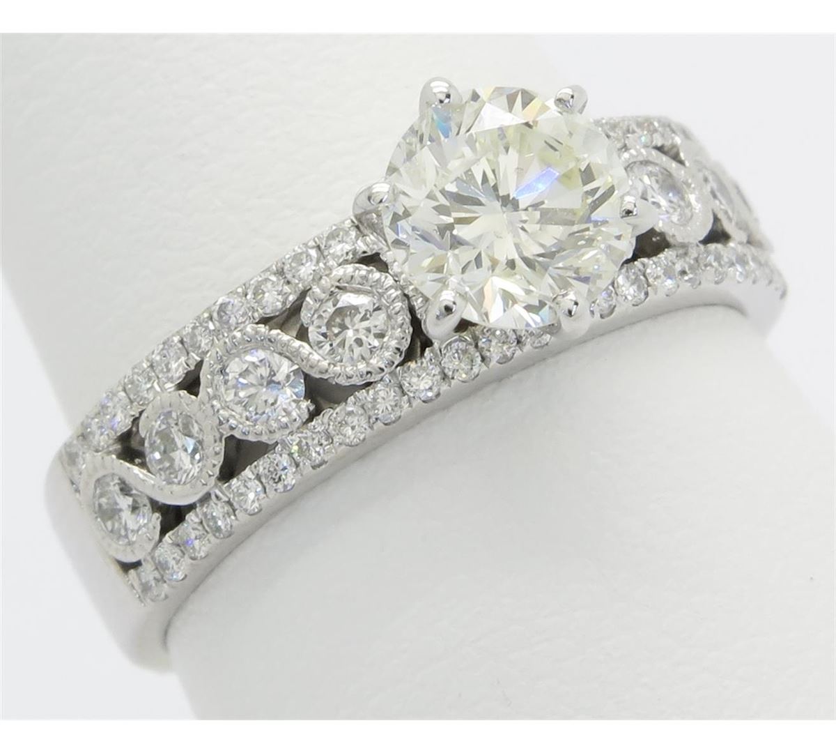 One tested 14K white gold diamond ring. Containing: One Round Brilliant Cut Diamond. Size: .98CT Clarity: I1 Color: J-K. 56 Round Brilliant Cut Diamonds. Approximate total diamond weight: 1.50CTW. Diamonds are graded in the mounting, unless otherwise stated. Weight of ring: 4.9 grams. Size: 6.75.