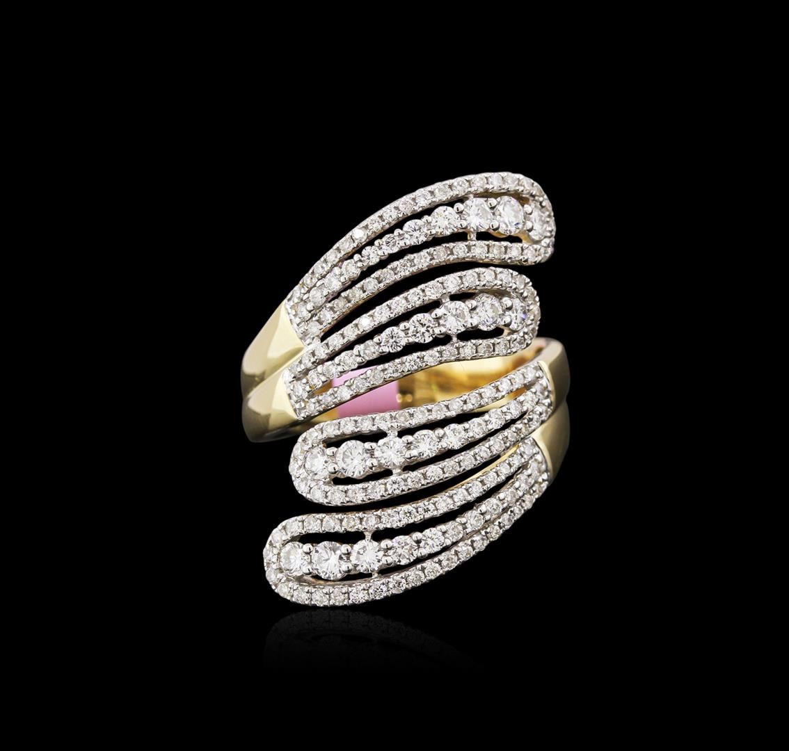 One electronically tested 14KT yellow gold lady's cast fashion ring with a bypass shank with a bright polish finish. Condition is new. Identified with markings of "14K". Containing: One hundred sixty-four prong set round brilliant cut diamonds, measuring 1.00 - 0.95 x 0.59mm (depth est.) approximate total weight of 164 Stones = 0.60ct. Graded in the setting. Clarity: VS-2 to I-1. Color: H - I. Cut: Good. Twenty shared prong set round brilliant cut diamonds, measuring 2.30 - 2.00 x 1.29mm (depth est.) approximate total weight of 20 Stones = 0.90ct. Graded in the setting. Clarity: VS-2 to SI-1. Color: H - I. Cut: Good. Total Weight of Diamonds: 1.50ct. Total Weight of Ring: 7.60 gm. GAS Appraised at $8,685.00.