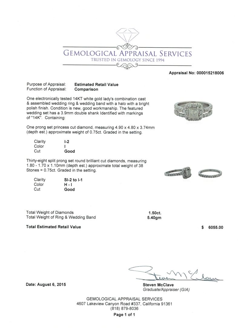 One electronically tested 14KT white gold lady's combination cast & assembled wedding ring & wedding band with a halo with a bright polish finish. The featured wedding set has a 3.9mm double shank Identified with markings of "14K". Condition is new, good workmanship. Containing: One prong set princess cut diamond, measuring 4.90 x 4.80 x 3.74mm (depth est.) approximate weight of 0.75ct. Graded in the setting. Clarity: I-2. Color: I. Cut Good Thirty-Eight split prong set round brilliant cut diamonds, measuring 1.80 - 1.70 x 1.10mm (depth est.) approximate. Total Weight of 38 Stones = 0.75ct. Graded in the setting. Clarity: SI-2 to I-1. Color: H - I. Cut Good. Total Weight of Diamonds 1.50ct. Total Weight of Ring & Wedding Band 5.40gm. GAS Appraised at $6,055.00.