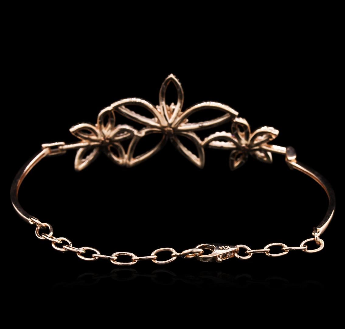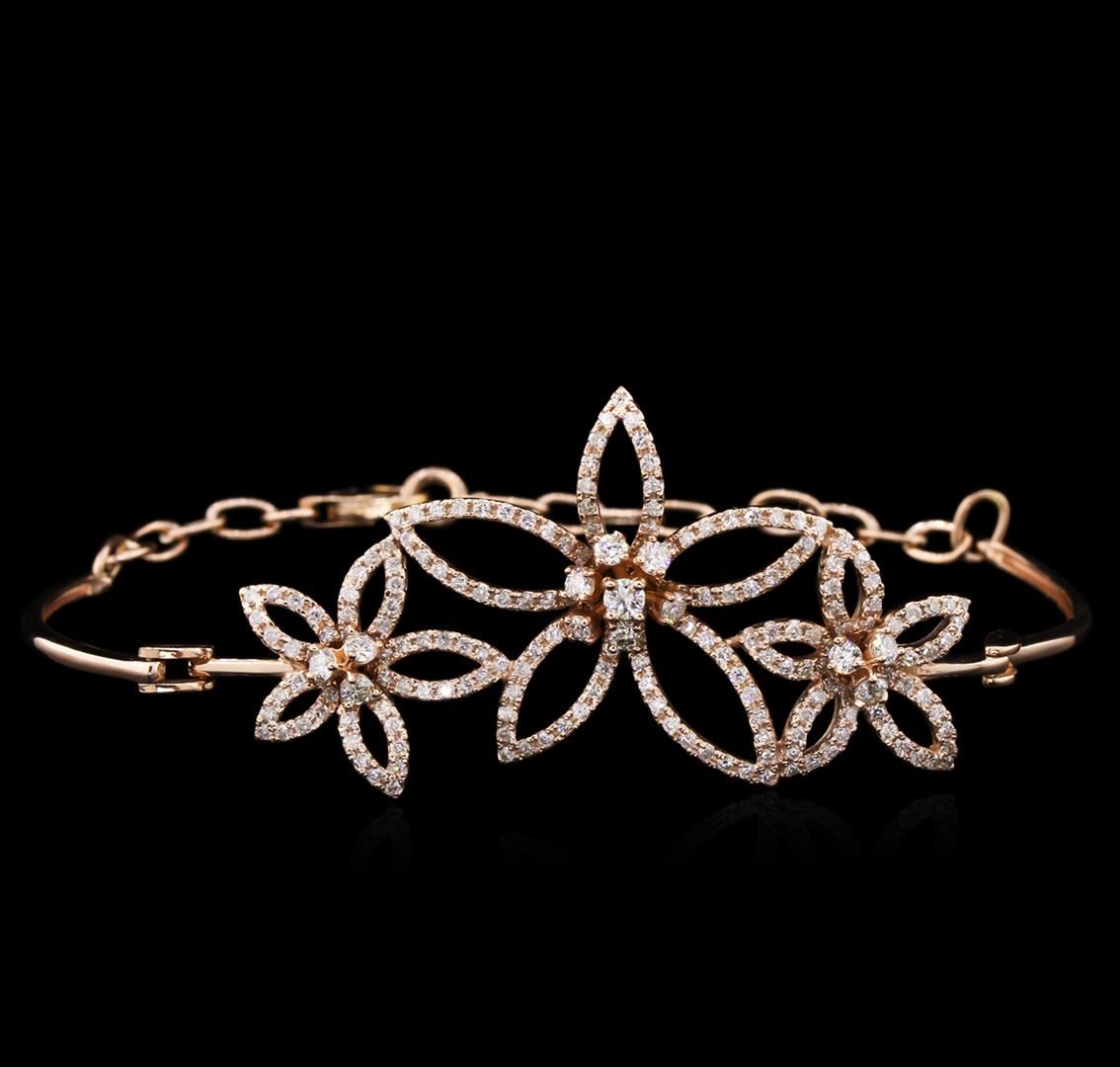 One electronically tested 14KT rose gold lady's combination cast & assembled fashion bracelet with a lobster claw clasp with a bright polish finish. The featured ladies bracelet has a floral motif and measures 7.00 inches in length. Identified with markings of "K14". Condition is new, good workmanship. Containing: Thirteen prong set round brilliant cut diamonds, measuring 2.50 - 2.00 x 1.46mm (depth est.) approximate total weight of 13 Stones = 0.48ct. Graded in the setting. Clarity: SI-1 to SI-2. Color: G - Good Two Hundred Two prong set round brilliant cut diamonds, measuring 1.20 - 1.10 x 0.69mm (depth est.) approximate total weight of 202 Stones = 1.03ct. Graded in the setting. Clarity: SI-1 to I-1. Color: H - I. Cut Good. Total Weight of Diamonds 1.51ct. Total Weight of Bracelet 9.70gm. GAS Appraised at $6,770.00.