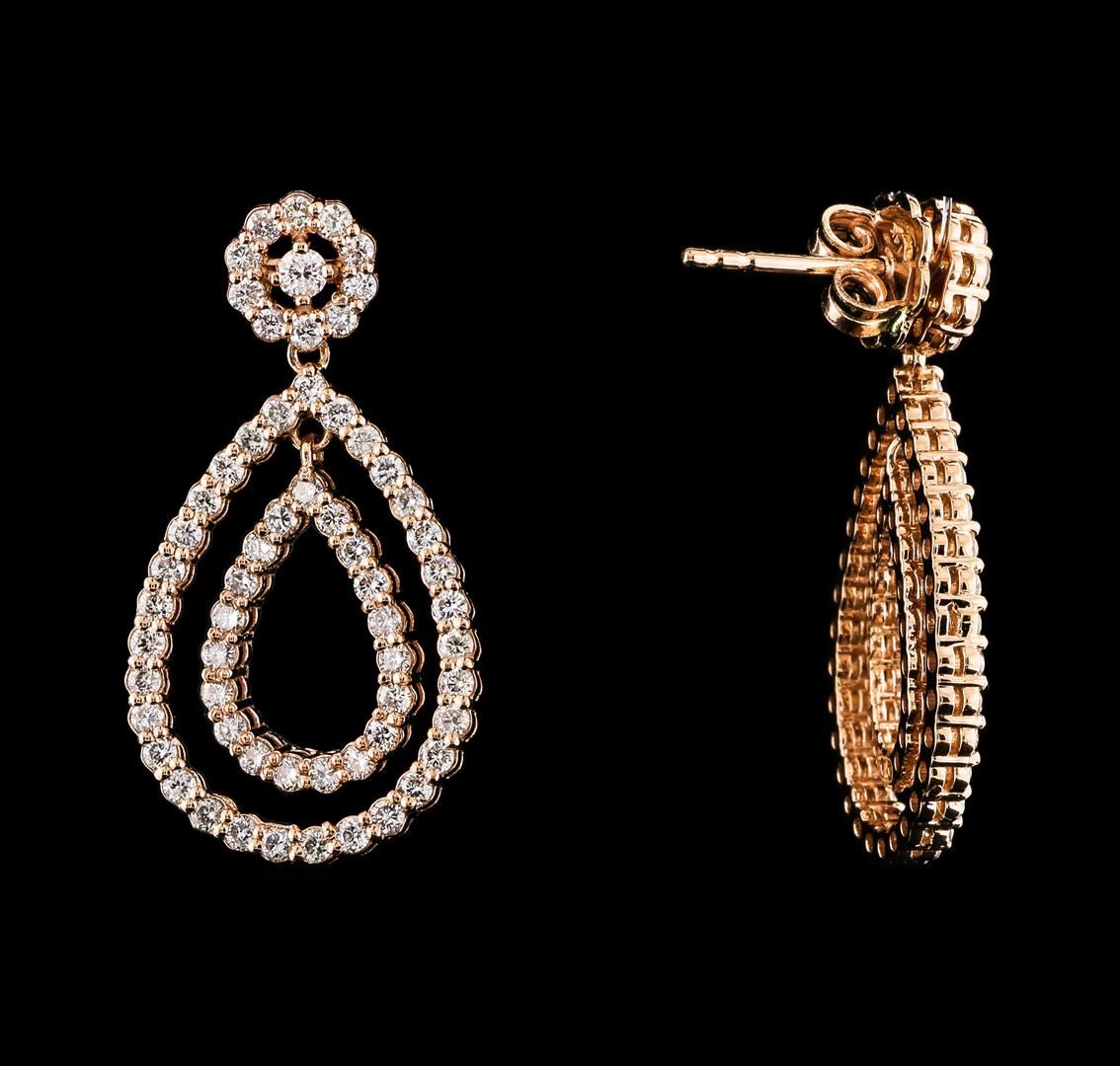 One pair electronically tested 14KT rose gold lady's combination cast & assembled dangle double teardrop earrings with friction posts with a bright polish finish. The featured lady's earrings have a drop of 28 millimeters. Identified with markings of '14K'. Condition is new, good workmanship. Containing: One Hundred Twenty prong set round brilliant cut diamonds, measuring 1.50 - 1.40 x 0.90mm (depth est.) approximate total weight of 120 Stones = 1.43ct. Graded in the setting. Clarity SI-1 to SI-2. Color: H - I Cut Good Two prong set round brilliant cut diamonds, measuring 2.25 - 2.15 x 1.32mm (depth est.) approximate total weight of 2 Stones = 0.08ct. Graded in the setting. Clarity SI-1 to I-1. Color: H - I Cut Good. Total Weight of Diamonds 1.51ct.. Total Weight of Earrings 5.90gm. GAS Appraised at $5,130.00.