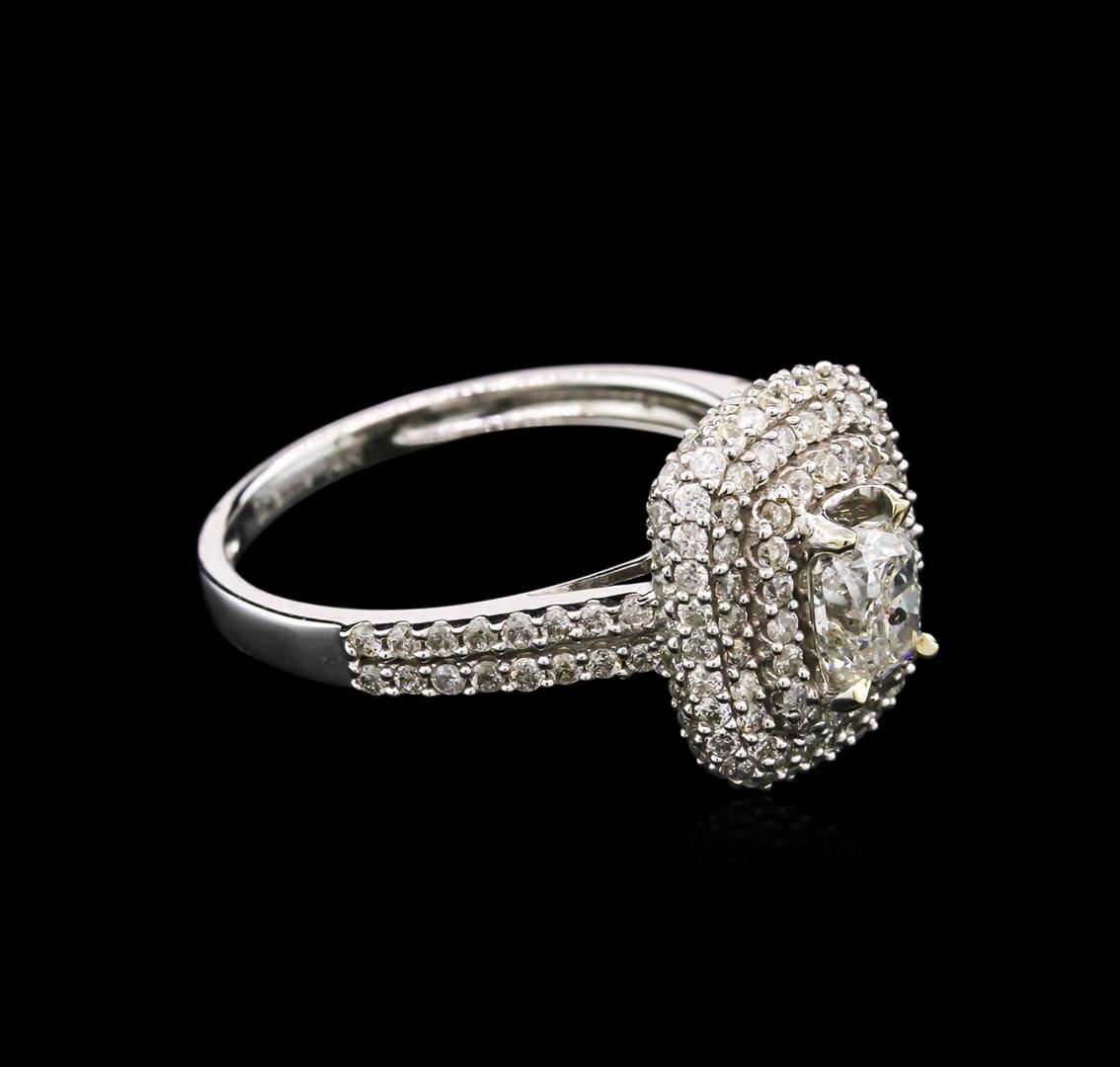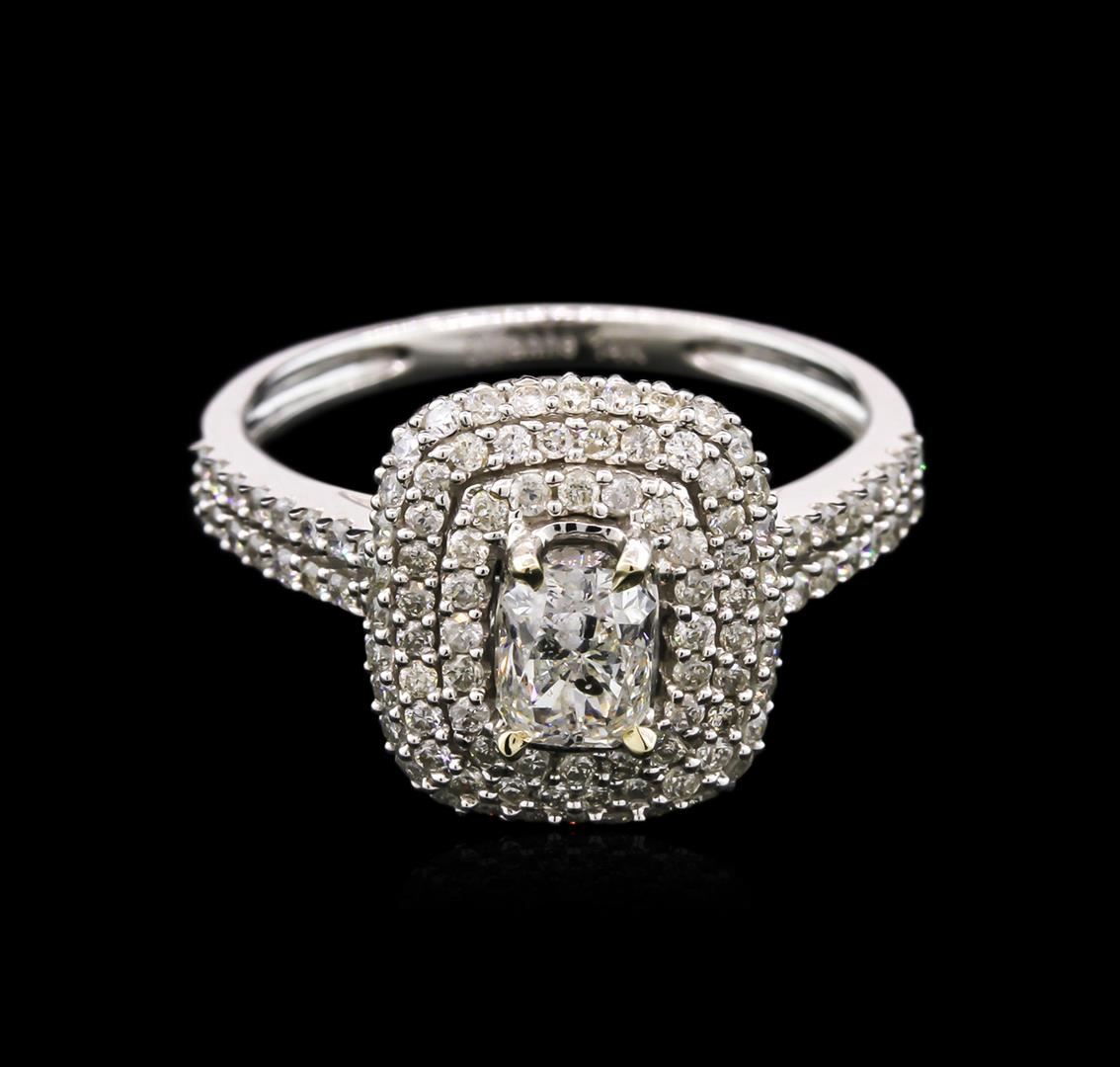 One electronically tested white gold ladies cast diamond unity ring. Condition is new, good workmanship. The featured diamond is set within tiered diamond bezels supported by a diamond set under gallery and diamond set split shoulders, completed by a two millimeter wide band. Bright polish finish with milgrain detaining. Trademark is Orianne. Containing: One prong set radiant shaped cut diamond, measuring 5.10x4.10x 3.08mm (depth est.) approximate weight of0.57ct. Faint brown secondary color throughout. Graded in the setting. Clarity: I-1.Color: J. Depth: 75.1%.Table: 65.9%.One hundred fifty-six prong set round brilliant cut diamonds, measuring 1.20 - 1.10 x 0.69mm (depth est.) approximate total weight of 156 Stones = 0.94ct. Graded in the setting. Clarity: SI-2 to I-2.Color: H - J. AIG Appraised at $6,665.00.