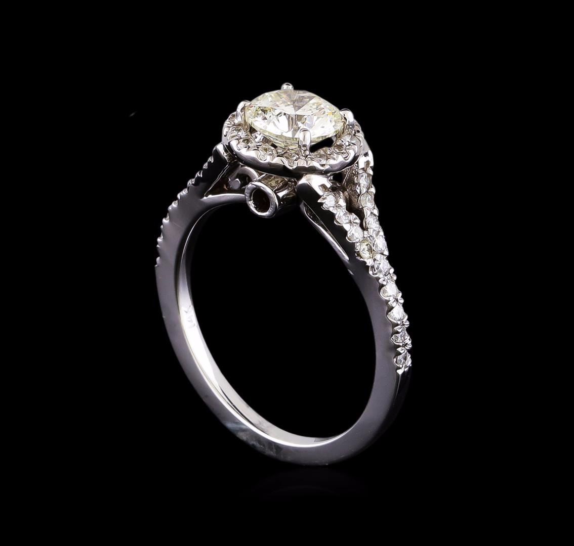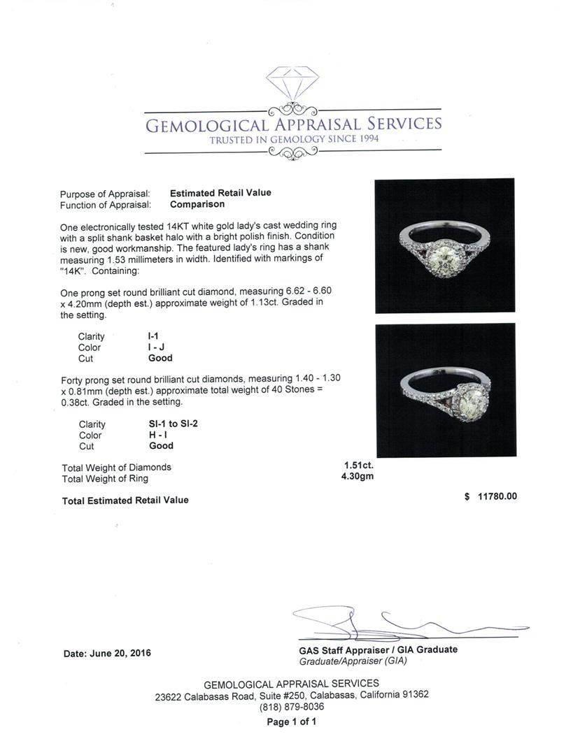 One electronically tested 14KT white gold lady's cast wedding ring with a split shank basket halo with a bright polish finish. The featured lady's ring has a shank measuring 1.53 millimeters in width. Identified with markings of "14K". Condition is new, good workmanship. Containing: One prong set round brilliant cut diamond, measuring 6.62 - 6.60 x 4.20mm (depth est.) approximate weight of 1.13ct. Graded in the setting. Clarity: I-1. Color: I - Good Forty prong set round brilliant cut diamonds, measuring 1.40 - 1.30 x 0.81mm (depth est.) approximate total weight of 40 Stones = 0.38ct. Graded in the setting. Clarity: SI-1 to SI-2. Color: H - I. Cut Good. Total Weight of Diamonds 1.51ct. Total Weight of Ring 4.30gm GAS Appraised at $11,780.00.