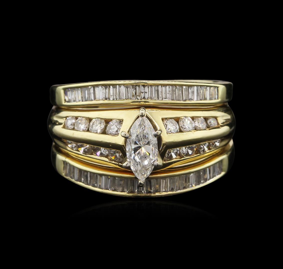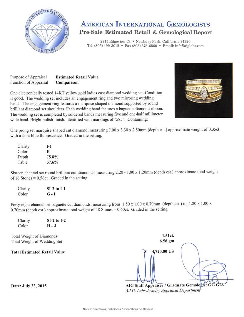 One electronically tested 14KT yellow gold ladies cast diamond wedding set. The wedding set includes an engagement ring and two mirroring wedding bands. The engagement ring features a marquise shaped diamond supported by round brilliant diamond set shoulders. Each wedding band features a baguette diamond ribbon. The wedding set is completed by soldered bands measuring five and one-half millimeter wide band. Bright polish finish. Identified with markings of "585". Condition is good. Containing: One prong set marquise shaped cut diamond, measuring 7.00 x 3.30 x 2.50mm (depth est.) approximate weight of 0.35ct with a faint blue fluorescence. Graded in the setting. Clarity: I-1. Color: 75.8%. Table 57.6%. Sixteen channel set round brilliant cut diamonds, measuring 2.20 - 1.80 x 1.20mm (depth est.) approximate. Total Weight of 16 Stones = 0.56ct. Graded in the setting. Clarity: SI-2 to I-1. Color: G - I Forty-Eight channel set baguette cut diamonds, measuring from 1.50 x 1.00 x 0.70mm (depth est.) to 1.80 x 1.00 x 0.70mm (depth est.) approximate. Total Weight of 48 Stones = 0.60ct. Graded in the setting. Clarity: SI-2 to I-2. Color: H - J. Total Weight of Diamonds 1.51ct. Total Weight of Wedding Set 6.56gm. AIG Appraised at $4,720.00.