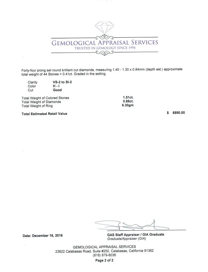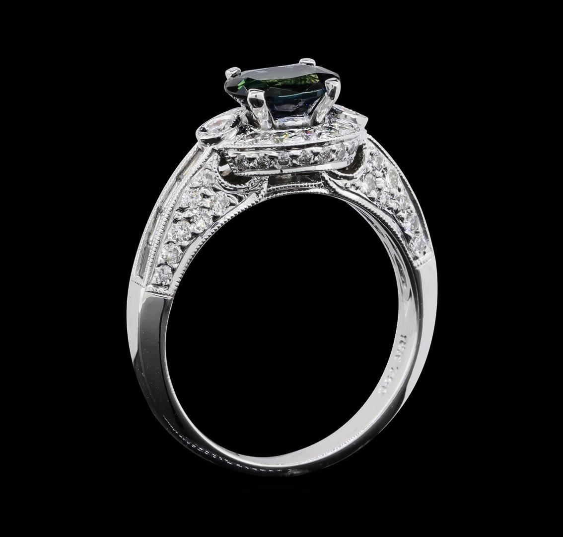 One electronically tested 18KT white gold lady's combination cast & assembled fashion ring with a cathedral halo with a bright polish with milgrain detailing finish. The featured lady's ring has a shank measuring 2.60 millimeters wide. Identified with markings of '18K 750'. Condition is new, good workmanship. Containing: One prong set oval modified mixed cut natural blue sapphire, measuring 7.80 x 5.82 x 3.78mm, (depth est.) 5%. bulge factor, approximate weight of 1.51ct., clarity is slightly included, medium dark, strong, very slightly greenish blue color, (GIA vslgB 6/5), cut is very good. Transmitting light with a minimum of distortion, transparent. Colored gemstones are presumed to have been subjected to commonly used enhancement processes. Graded in the setting. Eight channel set baguette cut diamonds, measuring from 2.40 x 1.20 x 1.03mm (depth est.) to 2.50 x 1.30 x 1.11mm (depth est.) approximate total weight of 8 Stones = 0.24ct. Graded in the setting. Clarity VS-1 to VS-2. Color: H - I Cut Very Good Two bezel set round brilliant cut diamonds, measuring 2.10 - 2.00 x 1.27mm (depth est.) approximate total weight of 2 Stones = 0.06ct. Graded in the setting. Clarity SI-1. Color: H Cut Good Ten prong set round brilliant cut diamonds, measuring 1.70 - 1.60 x 1.02mm (depth est.) approximate total weight of 10 Stones = 0.17ct. Graded in the setting. Clarity SI-1 to SI-3. Color: H - I Cut Good Forty-Four prong set round brilliant cut diamonds, measuring 1.40 - 1.30 x 0.84mm (depth est.) approximate total weight of 44 Stones = 0.41ct. Graded in the setting. Clarity VS-2 to SI-2. Color: H - I Cut Good. Total Weight of Colored Stones 1.51ct.. Total Weight of Diamonds 0.88ct.. Total Weight of Ring 6.30gm. GAS Appraised at $6,890.00.