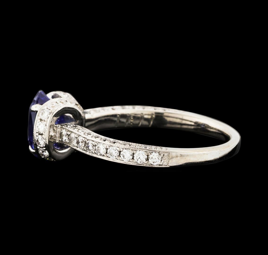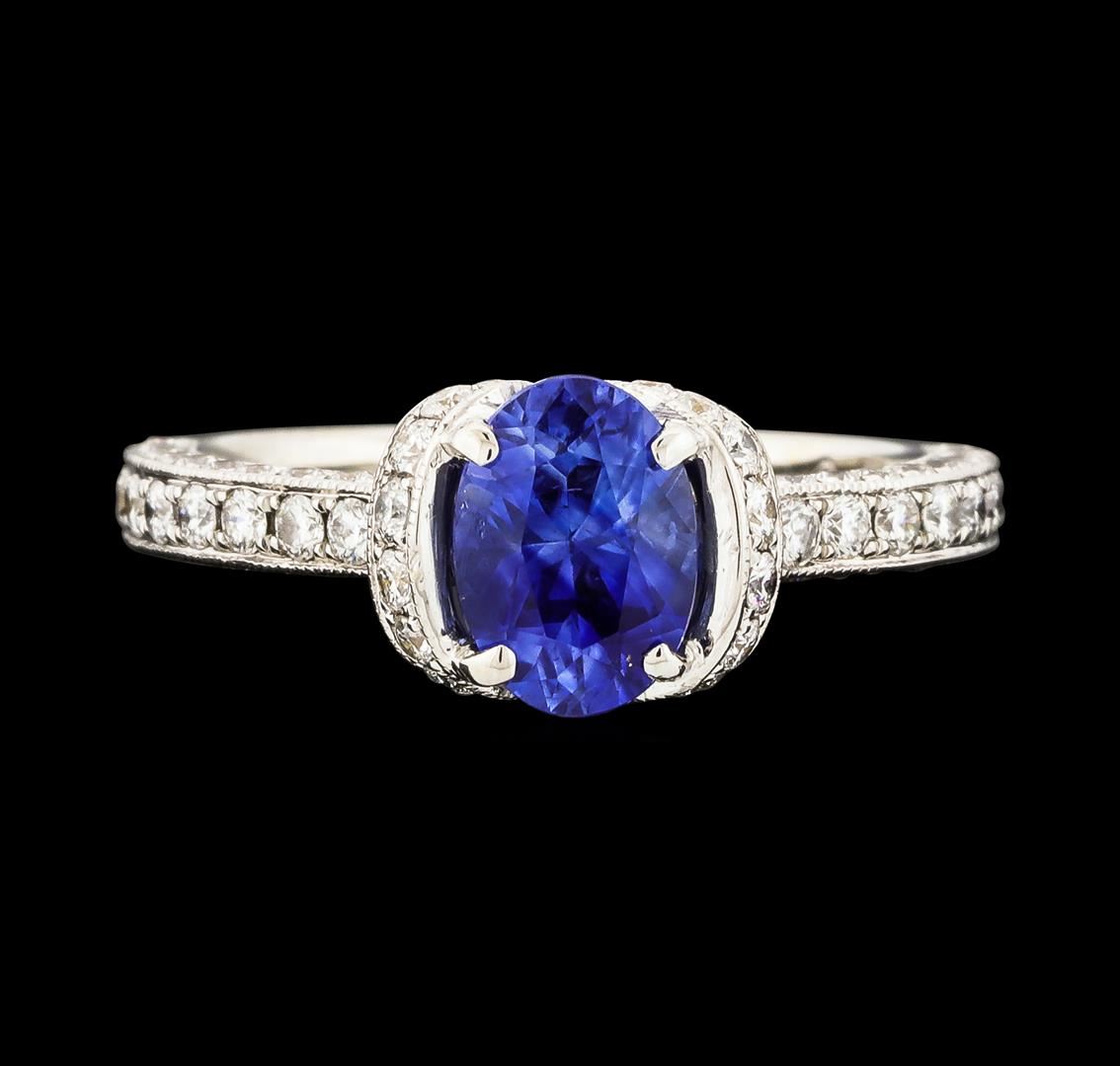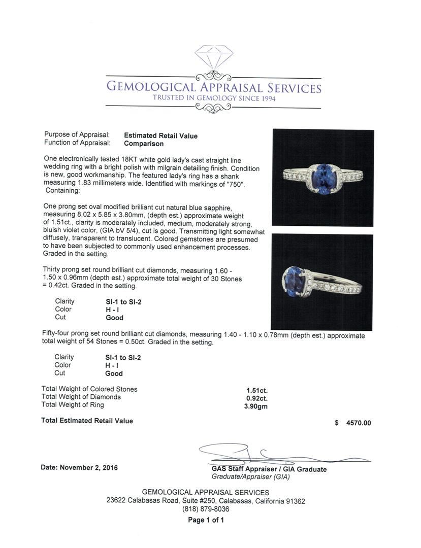 One electronically tested 18KT white gold lady's cast straight line wedding ring with a bright polish with milgrain detailing finish. The featured lady's ring has a shank measuring 1.83 millimeters wide. Identified with markings of '750'. Condition is new, good workmanship. Containing: One prong set oval modified brilliant cut natural blue sapphire, measuring 8.02 x 5.85 x 3.80mm, (depth est.) approximate weight of 1.51ct., clarity is moderately included, medium, moderately strong, bluish violet color, (GIA bV 5/4), cut is good. Transmitting light somewhat diffusely, transparent to translucent. Colored gemstones are presumed to have been subjected to commonly used enhancement processes. Graded in the setting. Thirty prong set round brilliant cut diamonds, measuring 1.60 - 1.50 x 0.96mm (depth est.) approximate total weight of 30 Stones = 0.42ct. Graded in the setting. Clarity SI-1 to SI-2. Color: H - I Cut Good Fifty-Four prong set round brilliant cut diamonds, measuring 1.40 - 1.10 x 0.78mm (depth est.) approximate total weight of 54 Stones = 0.50ct. Graded in the setting. Clarity SI-1 to SI-2. Color: H - I Cut Good. Total Weight of Colored Stones 1.51ct.. Total Weight of Diamonds 0.92ct.. Total Weight of Ring 3.90gm. GAS Appraised at $4,570.00.