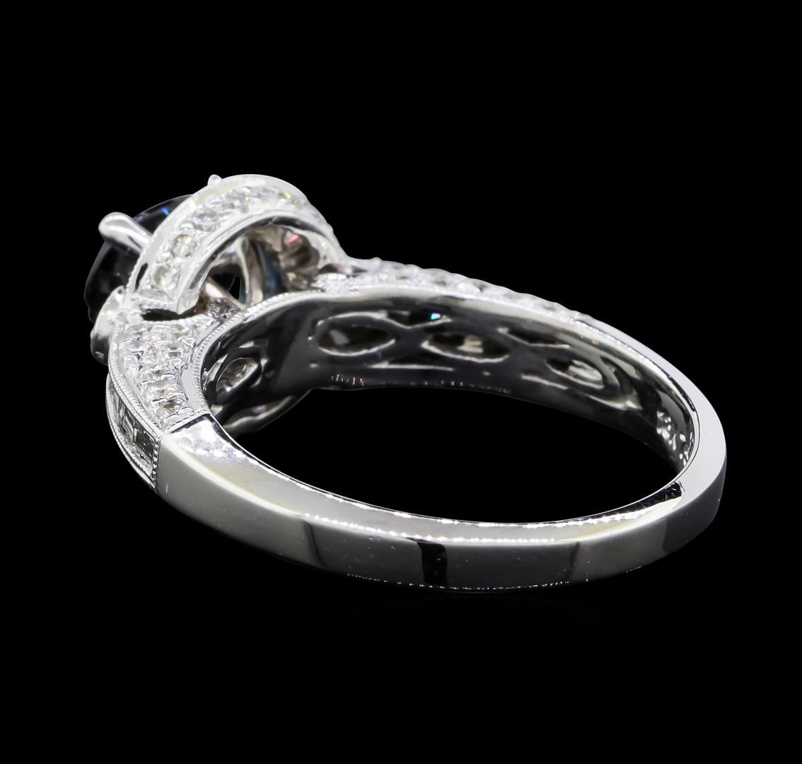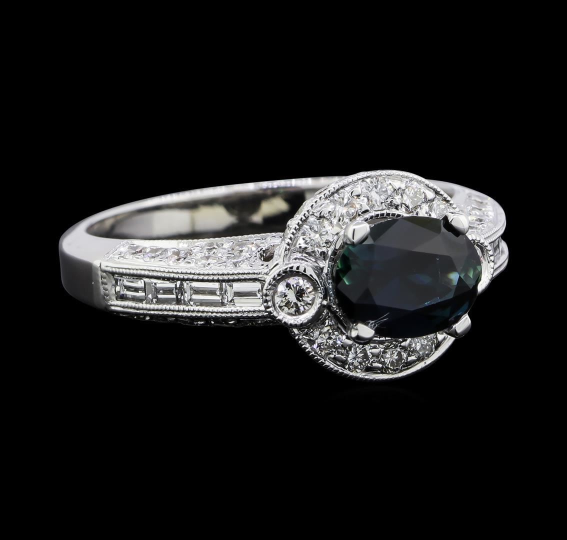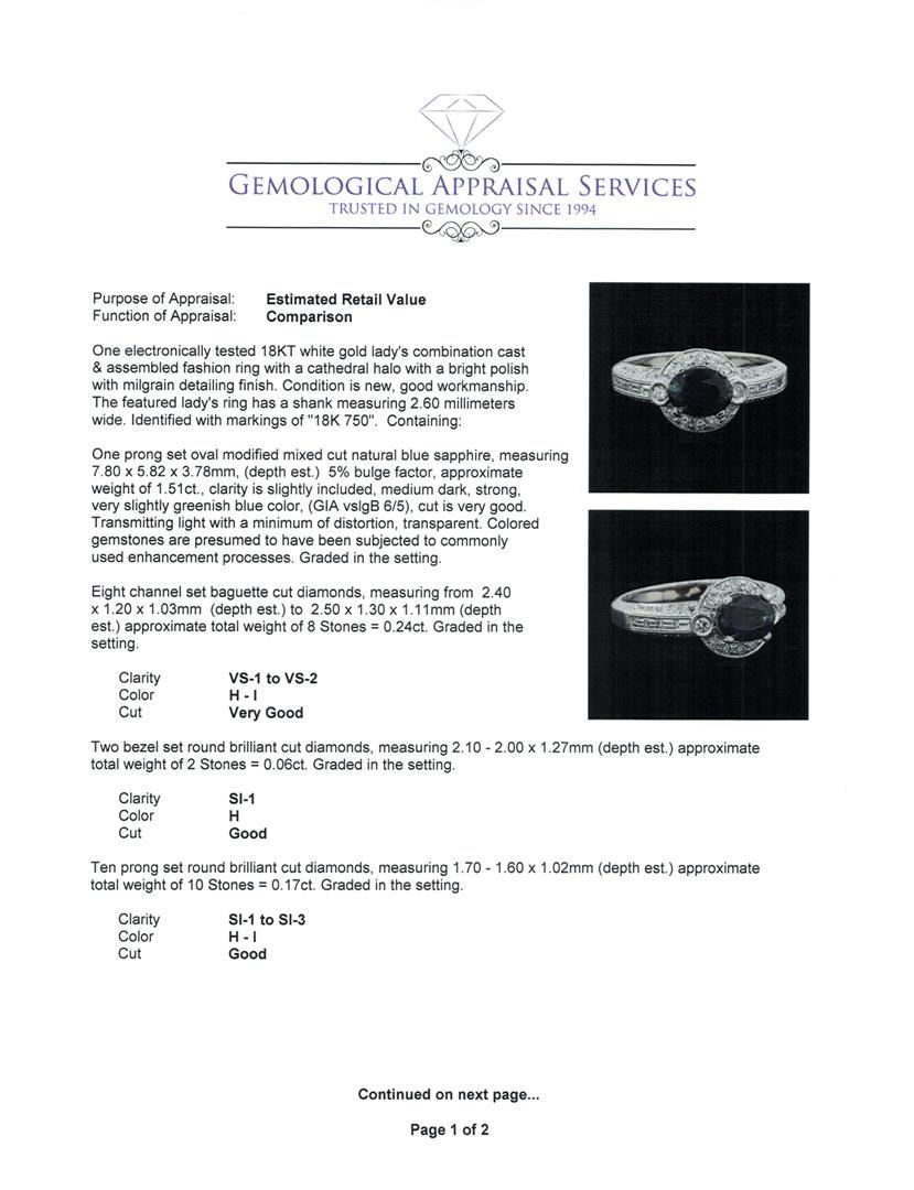 One electronically tested 18KT white gold lady's combination cast & assembled fashion ring with a cathedral halo with a bright polish with milgrain detailing finish. The featured lady's ring has a shank measuring 2.60 millimeters wide. Identified with markings of '18K 750'. Condition is new, good workmanship. Containing: One prong set oval modified mixed cut natural blue sapphire, measuring 7.80 x 5.82 x 3.78mm, (depth est.) 5%. bulge factor, approximate weight of 1.51ct., clarity is slightly included, medium dark, strong, very slightly greenish blue color, (GIA vslgB 6/5), cut is very good. Transmitting light with a minimum of distortion, transparent. Colored gemstones are presumed to have been subjected to commonly used enhancement processes. Graded in the setting. Eight channel set baguette cut diamonds, measuring from 2.40 x 1.20 x 1.03mm (depth est.) to 2.50 x 1.30 x 1.11mm (depth est.) approximate total weight of 8 Stones = 0.24ct. Graded in the setting. Clarity VS-1 to VS-2. Color: H - I Cut Very Good Two bezel set round brilliant cut diamonds, measuring 2.10 - 2.00 x 1.27mm (depth est.) approximate total weight of 2 Stones = 0.06ct. Graded in the setting. Clarity SI-1. Color: H Cut Good Ten prong set round brilliant cut diamonds, measuring 1.70 - 1.60 x 1.02mm (depth est.) approximate total weight of 10 Stones = 0.17ct. Graded in the setting. Clarity SI-1 to SI-3. Color: H - I Cut Good Forty-Four prong set round brilliant cut diamonds, measuring 1.40 - 1.30 x 0.84mm (depth est.) approximate total weight of 44 Stones = 0.41ct. Graded in the setting. Clarity VS-2 to SI-2. Color: H - I Cut Good. Total Weight of Colored Stones 1.51ct.. Total Weight of Diamonds 0.88ct.. Total Weight of Ring 6.30gm. GAS Appraised at $6,890.00.