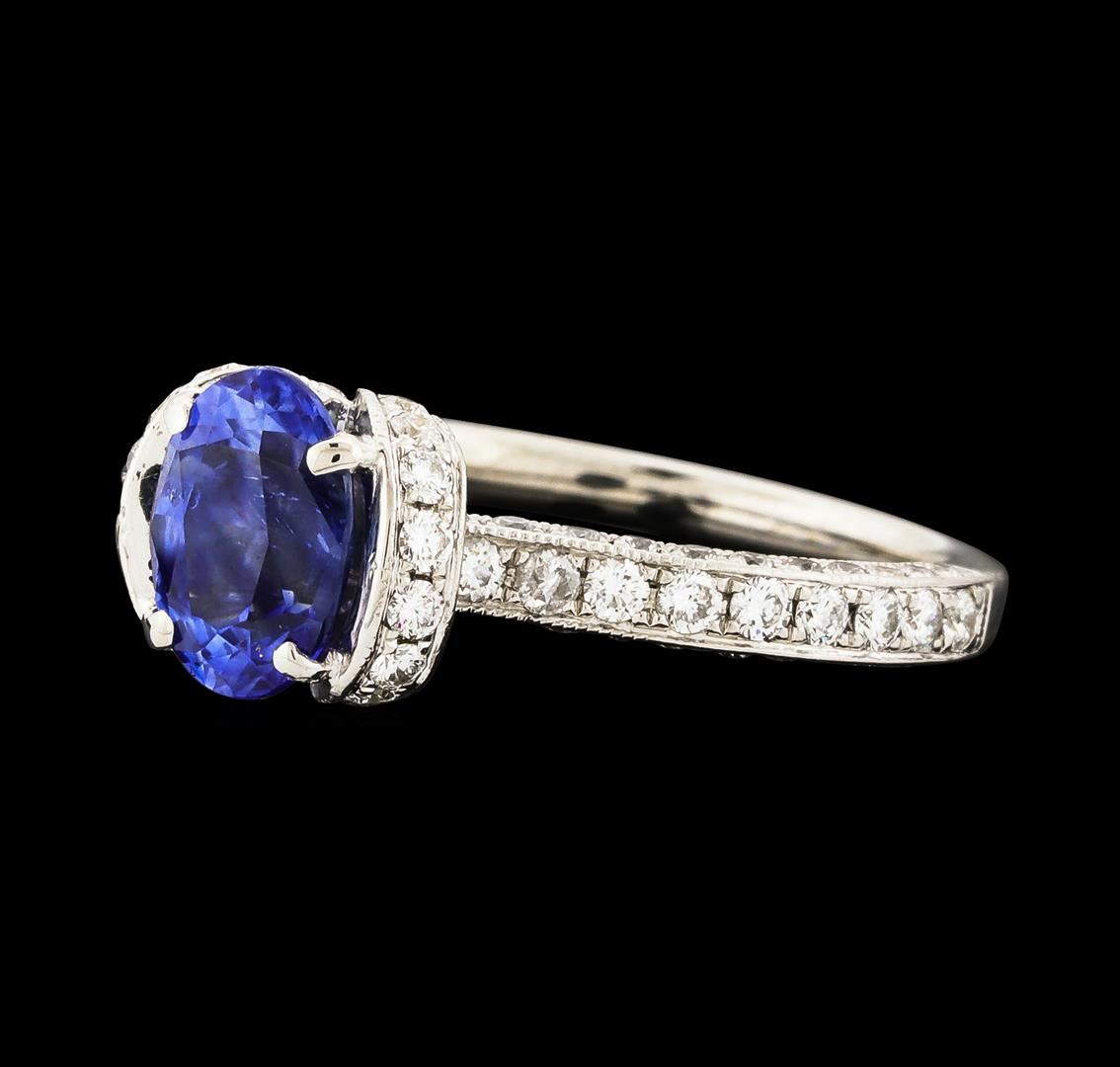 One electronically tested 18KT white gold lady's cast straight line wedding ring with a bright polish with milgrain detailing finish. The featured lady's ring has a shank measuring 1.83 millimeters wide. Identified with markings of '750'. Condition is new, good workmanship. Containing: One prong set oval modified brilliant cut natural blue sapphire, measuring 8.02 x 5.85 x 3.80mm, (depth est.) approximate weight of 1.51ct., clarity is moderately included, medium, moderately strong, bluish violet color, (GIA bV 5/4), cut is good. Transmitting light somewhat diffusely, transparent to translucent. Colored gemstones are presumed to have been subjected to commonly used enhancement processes. Graded in the setting. Thirty prong set round brilliant cut diamonds, measuring 1.60 - 1.50 x 0.96mm (depth est.) approximate total weight of 30 Stones = 0.42ct. Graded in the setting. Clarity SI-1 to SI-2. Color: H - I Cut Good Fifty-Four prong set round brilliant cut diamonds, measuring 1.40 - 1.10 x 0.78mm (depth est.) approximate total weight of 54 Stones = 0.50ct. Graded in the setting. Clarity SI-1 to SI-2. Color: H - I Cut Good. Total Weight of Colored Stones 1.51ct.. Total Weight of Diamonds 0.92ct.. Total Weight of Ring 3.90gm. GAS Appraised at $4,570.00.
