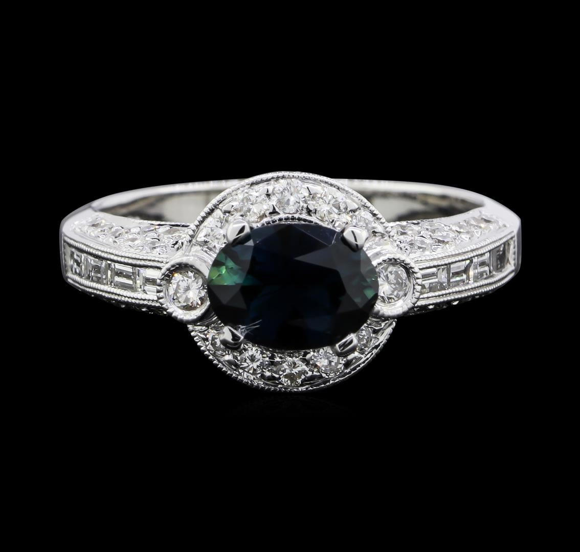 One electronically tested 18KT white gold lady's combination cast & assembled fashion ring with a cathedral halo with a bright polish with milgrain detailing finish. The featured lady's ring has a shank measuring 2.60 millimeters wide. Identified with markings of '18K 750'. Condition is new, good workmanship. Containing: One prong set oval modified mixed cut natural blue sapphire, measuring 7.80 x 5.82 x 3.78mm, (depth est.) 5%. bulge factor, approximate weight of 1.51ct., clarity is slightly included, medium dark, strong, very slightly greenish blue color, (GIA vslgB 6/5), cut is very good. Transmitting light with a minimum of distortion, transparent. Colored gemstones are presumed to have been subjected to commonly used enhancement processes. Graded in the setting. Eight channel set baguette cut diamonds, measuring from 2.40 x 1.20 x 1.03mm (depth est.) to 2.50 x 1.30 x 1.11mm (depth est.) approximate total weight of 8 Stones = 0.24ct. Graded in the setting. Clarity VS-1 to VS-2. Color: H - I Cut Very Good Two bezel set round brilliant cut diamonds, measuring 2.10 - 2.00 x 1.27mm (depth est.) approximate total weight of 2 Stones = 0.06ct. Graded in the setting. Clarity SI-1. Color: H Cut Good Ten prong set round brilliant cut diamonds, measuring 1.70 - 1.60 x 1.02mm (depth est.) approximate total weight of 10 Stones = 0.17ct. Graded in the setting. Clarity SI-1 to SI-3. Color: H - I Cut Good Forty-Four prong set round brilliant cut diamonds, measuring 1.40 - 1.30 x 0.84mm (depth est.) approximate total weight of 44 Stones = 0.41ct. Graded in the setting. Clarity VS-2 to SI-2. Color: H - I Cut Good. Total Weight of Colored Stones 1.51ct.. Total Weight of Diamonds 0.88ct.. Total Weight of Ring 6.30gm. GAS Appraised at $6,890.00.