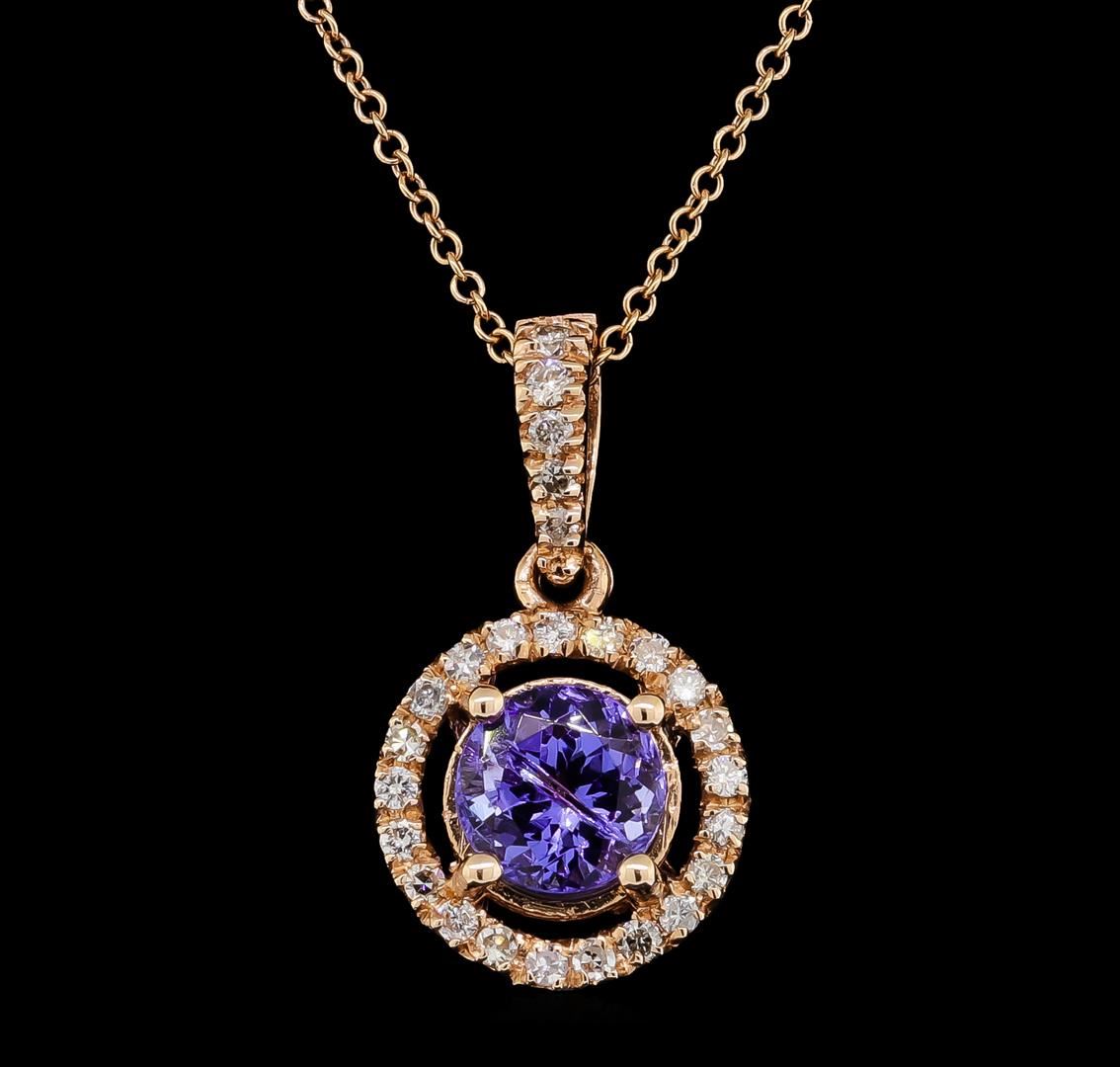 One Pendant with chain : 14KT rose gold weighing 5.40gm containing tanzanite with a total weight of 1.51ct and side diamonds weighing 0.29ctw.
