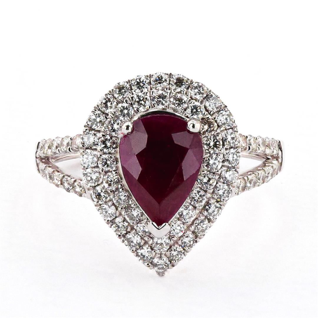 1.52ct BURMESE Ruby and 0.82ctw Diamond Platinum Ring (GIA CERTIFIED). Platinum (PLAT) natural burmese ruby corundum and diamond ring. A pear brilliant cut natural burmese ruby corundum gemstone is mounted in the center of the ring. Round brilliant cut diamonds accent the ring around and on both sides of the center gemstone. The ring has a gross weight of 5.6 Grams. Reference: GIA Ruby Report 2221112463 NATURAL GEMSTONE GEMSTONE: Burma Ruby Corundum NATURE: Natural SHAPE: Pear Brilliant, Faceted Cut WEIGHT: 1.52 carat total DIMENSIONS: 8.99 x 6.63 x 3.43mm CLARITY: Type 3 COLOR: Purplish Red (5/5) SYMMETRY: Excellent COLOR INTENSITY: Intense TRANSPARENCY: Semi-Transparent-Translucent TONE: Dark NATURAL DIAMOND SHAPE: Round Brilliant Cut WEIGHT: 0.82 carat total (66pcs.) DIMENSIONS: 1.5 x 1.4mm AVERAGE CLARITY: VS1-VS2 AVERAGE COLOR: F-G SYMMETRY: Excellent POLISH: Excellent METAL METAL: Platinum PURITY: 950 COLOR: White CONDITION: Excellent FINISH: High Polish