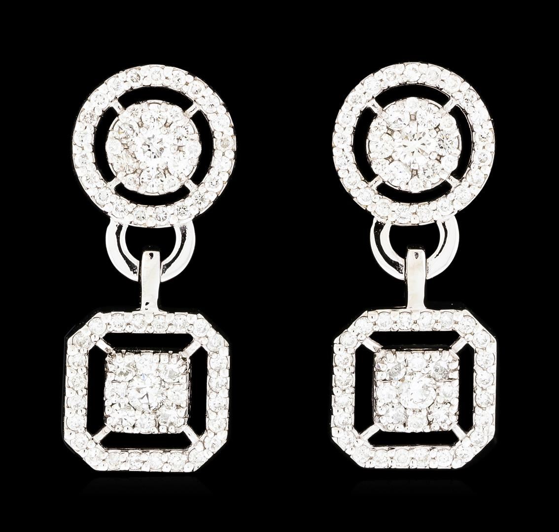 One pair electronically tested 14KT white gold lady's combination cast & assembled fashion dangle earrings with friction posts with a bright polish finish. The featured lady's dangle earrings have a drop of approximately 27 millimeters. Identified with markings of '14K'. Condition is new, good workmanship. Containing: Four prong set round brilliant cut diamonds, measuring 2.80 - 2.70 x 1.71mm (depth est.) approximate total weight of 4 Stones = 0.31ct. Graded in the setting. Clarity SI-1 to SI-2. Color: H - I Cut Good Twenty prong set round brilliant cut diamonds, measuring 1.95 - 1.85 x 1.18mm (depth est.) approximate total weight of 20 Stones = 0.51ct. Graded in the setting. Clarity SI-1 to SI-3. Color: H - I Cut Good Eight prong set round brilliant cut diamonds, measuring 1.40 - 1.35 x 0.86mm (depth est.) approximate total weight of 8 Stones = 0.08ct. Graded in the setting. Clarity SI-1 to SI-2. Color: H - I Cut Good Ninety prong set round brilliant cut diamonds, measuring 1.25 - 1.15 x 0.72mm (depth est.) approximate total weight of 90 Stones = 0.56ct. Graded in the setting. Clarity SI-1 to I-1. Color: H - I Cut Good Twelve prong set round brilliant cut diamonds, measuring 1.10 - 1.05 x 0.67mm (depth est.) approximate total weight of 12 Stones = 0.06ct. Graded in the setting. Clarity SI-1 to I-1. Color: H - I Cut Good. Total Weight of Diamonds 1.52ct.. Total Weight of Earrings 6.40gm. GAS Appraised at $5,410.00.